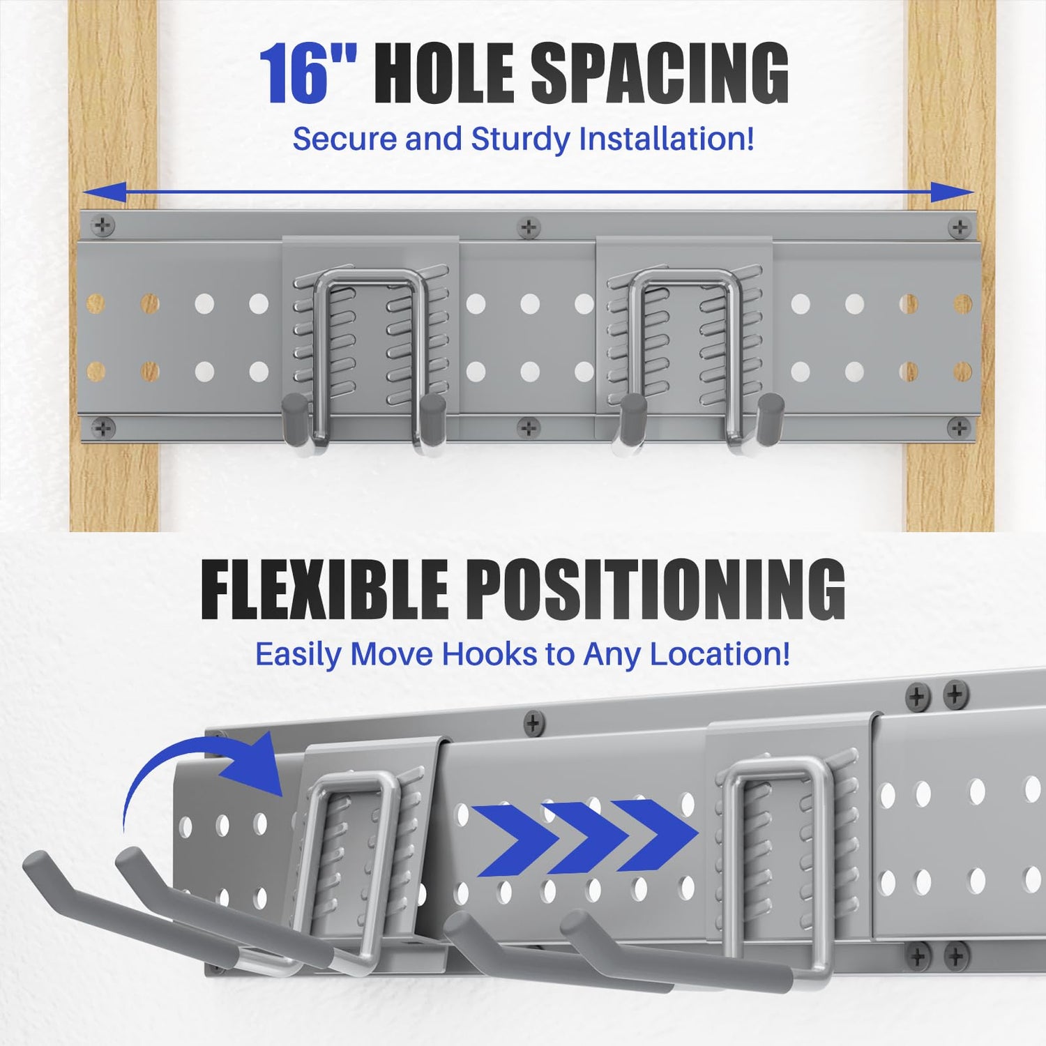 - Stable and Secure: Built with 16-inch stud spacing, this garage wall organizer locks into your wall like it was made for it. And if you’re mounting on drywall, no worries—we’ve included the right screws so your garage tool rack stays steady and reliable on any surface.