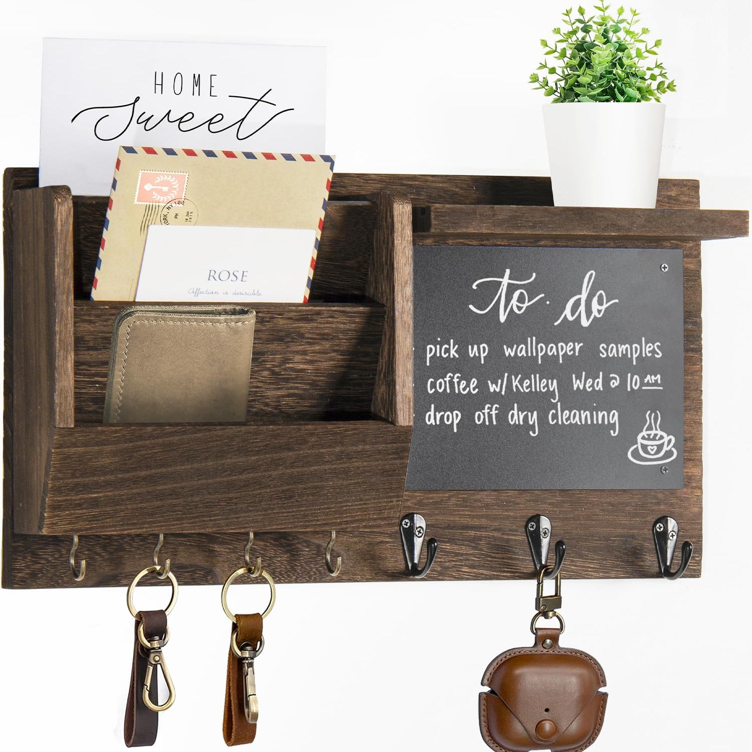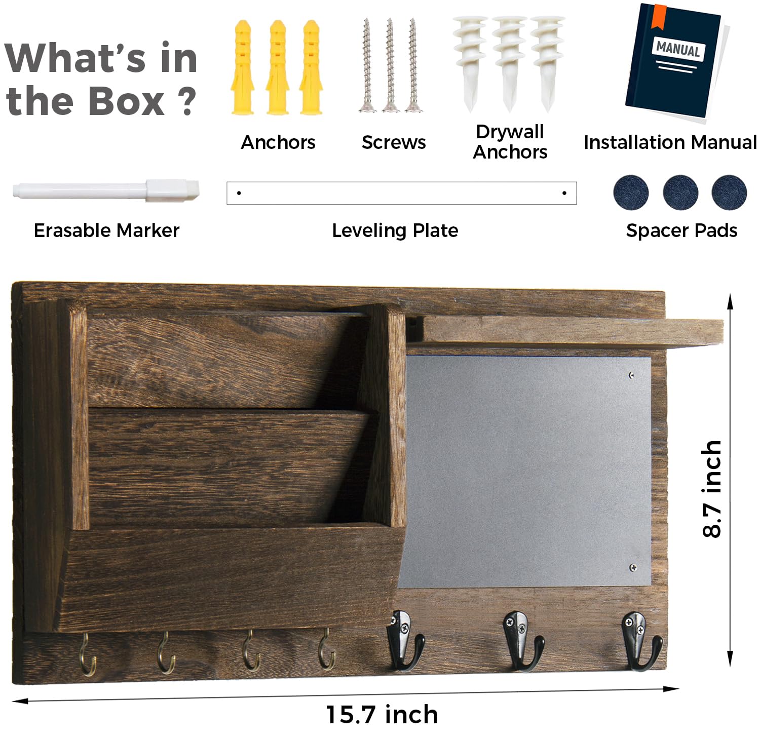 Details: Ziivita key holder and mail holder features 7 metal hooks, 3 slots for mail, 1 integrated display shelf and a large chalkboard. Make organization a priority, but do it in style. Constructed with high-quality solid pine wood with matte finish and sturdy metal hooks, it's ideal for entryway organization and perfect for keys, accessories, mail, and displaying your favorite photo or small decorative items.