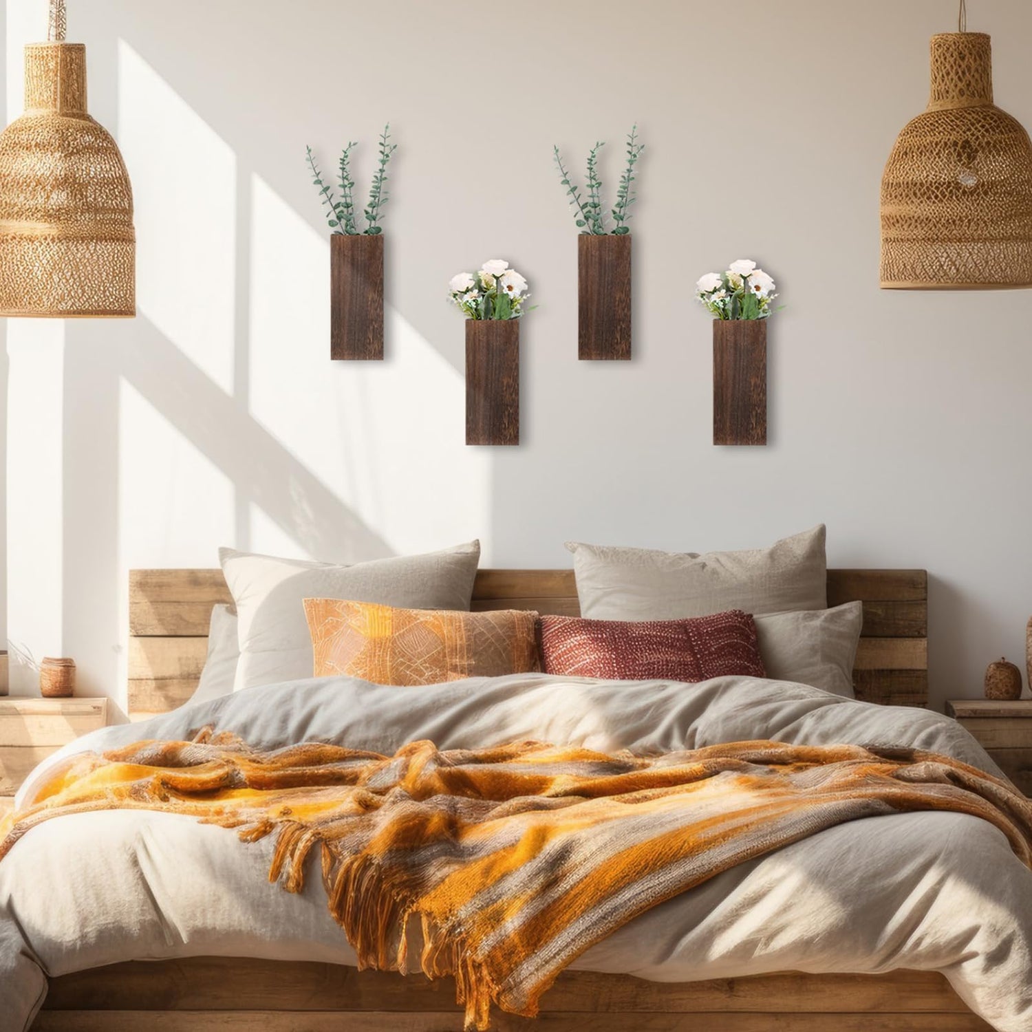These wall vases for plants indoor have an elegant and stylish design that adds a sense of sophistication to the room. The brown color of the wood is warm and inviting, creating a cozy and welcoming atmosphere. The simple yet elegant design of these planters makes them ideal for various home decor styles, from modern to rustic.