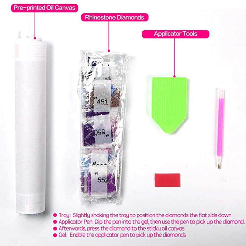 - 100% full-round drill 5d diamond painting kit: This kit includes everything you need to complete your diamond painting project, including diamonds, canvas, adhesive,diamond applicator pen and plastic tray.