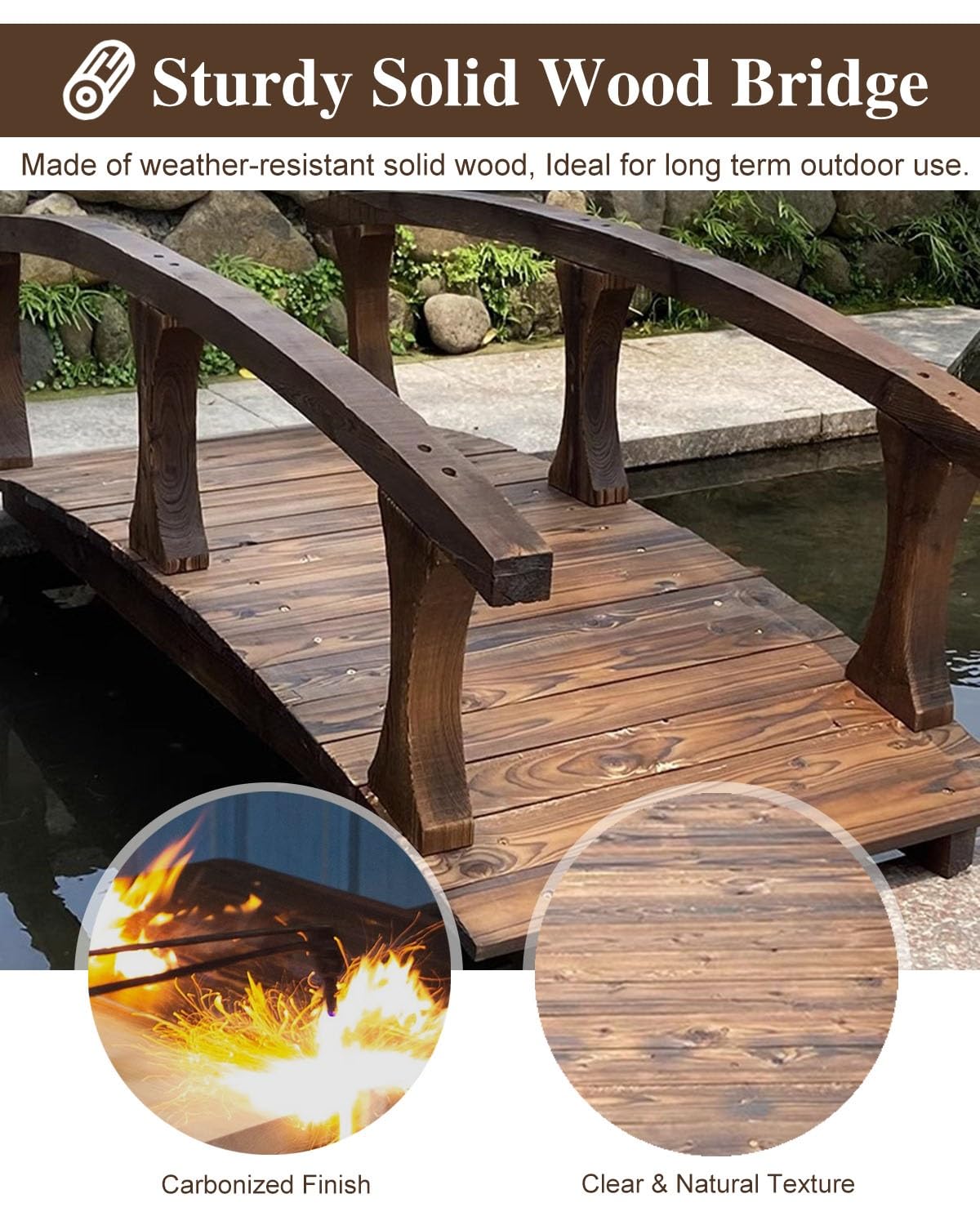 - ✅ Solid Wood Little Bridge --- Our garden bridges made of durable solid wood. The surface is carbonized, sunproof, moisture-proof and weather-resistant. It can withstand all kinds of bad weather.