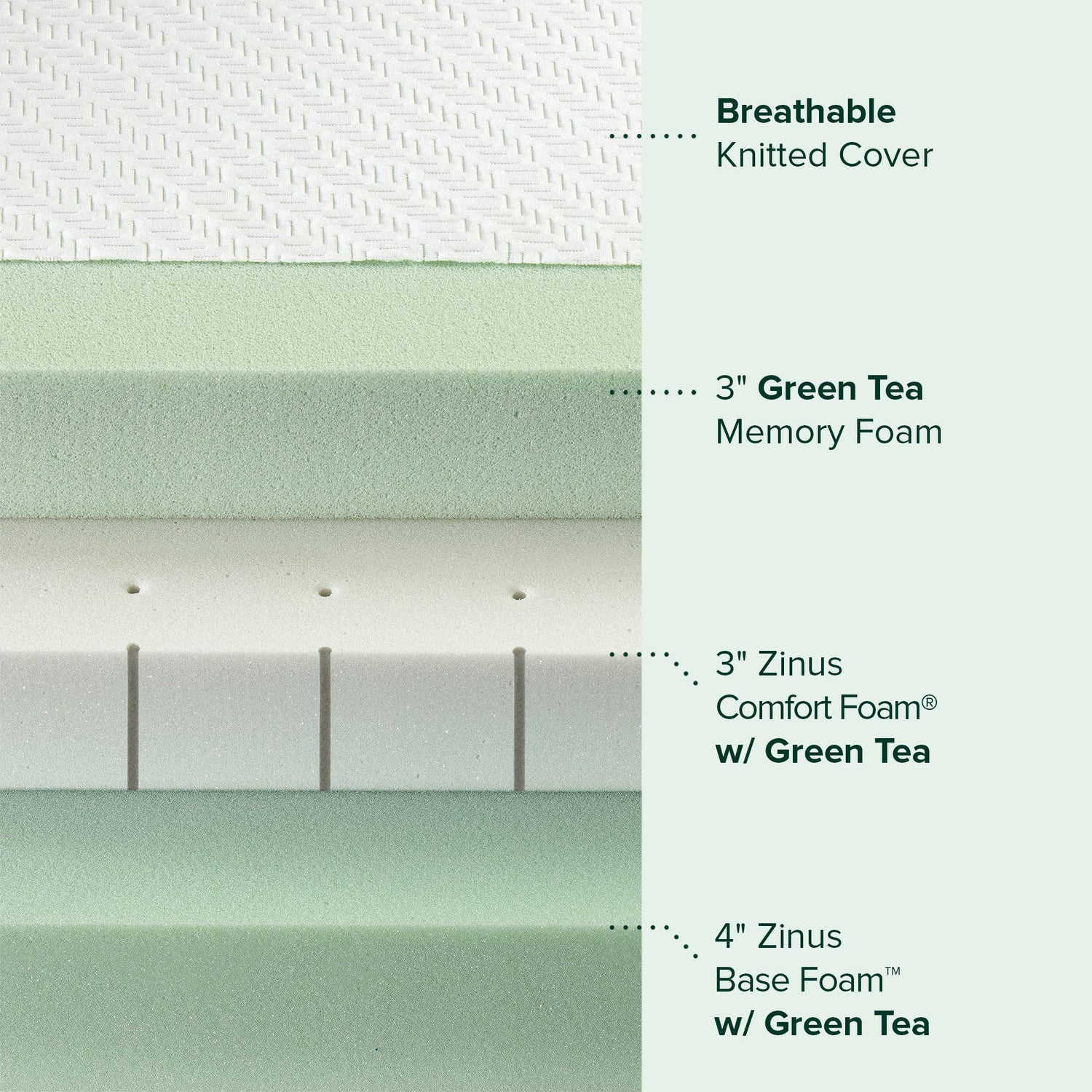 Details: How do we improve one of our most loved mattresses? Innovate and elevate every layer to create a new high performance mattress that's still affordable of course - introducing the all-new Green Tea Luxe Memory Foam Mattress. More is better when it comes to all the great sleep-inducing qualities you love. We infused premium green tea into each and every layer to deliver even more freshness in your mattress night and day. More memory foam in every profile height means more comfort and more sleep. With the just right amount of pressure relief- not too much sink- you’ll sleep with an even more supportive feeling that relieves your achiest joints. No need to worry about overheating as our patented 7-zone ventilation system in the middle layer improves airflow performance, while also adding extra pressure relief beneath areas that need it most, like the shoulders, hips and knees. The finishing touch? A breathable knitted cover for ultra comfortable and refreshing sleep. Shipped straight to your door with a 10-year warranty, we certainly didn’t sleep on improving every single performance layer of this mattress.