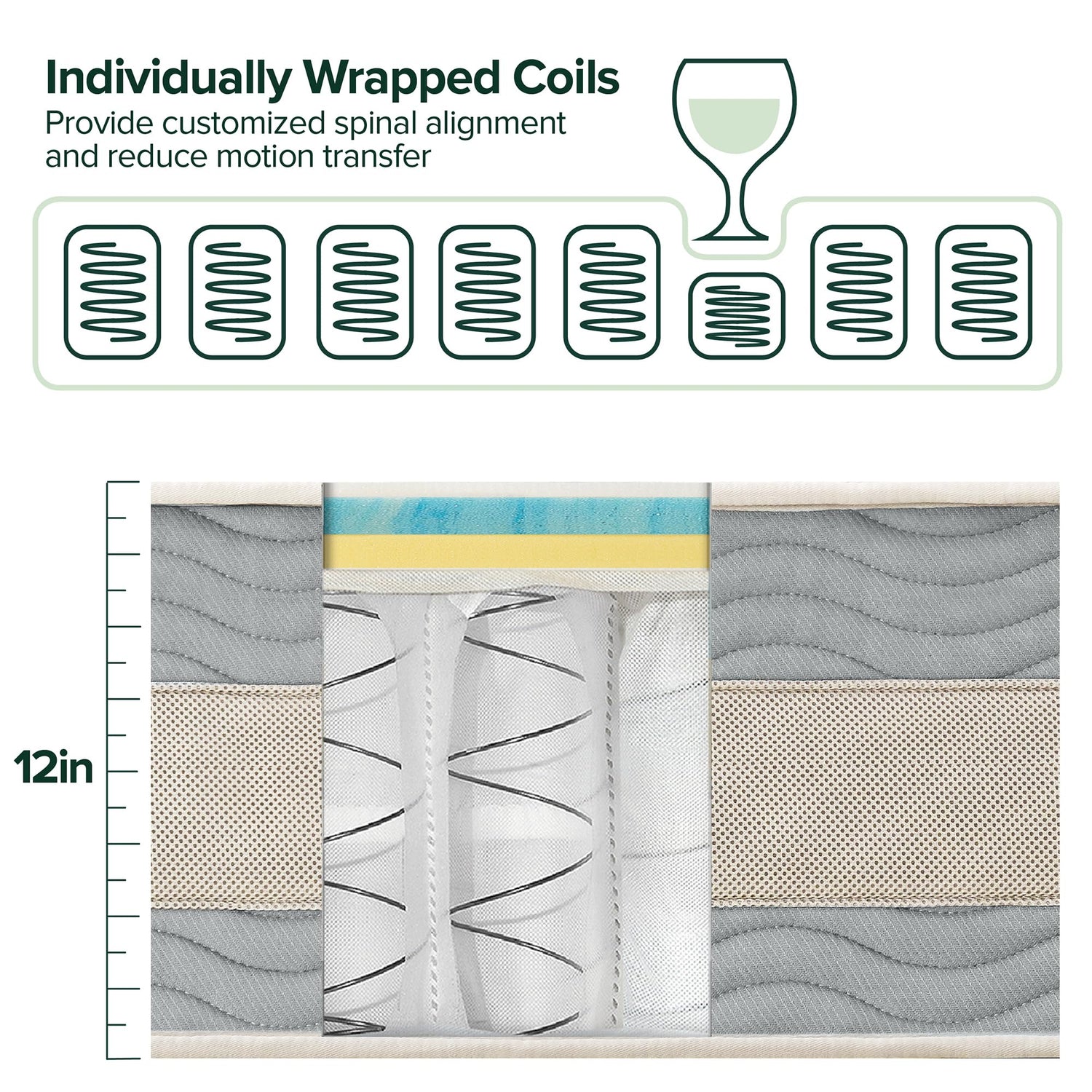- CUSTOMIZED COMFORT – Individually wrapped coils respond independently to your movements to provide customized spinal alignment and help reduce disturbances from a restless partner