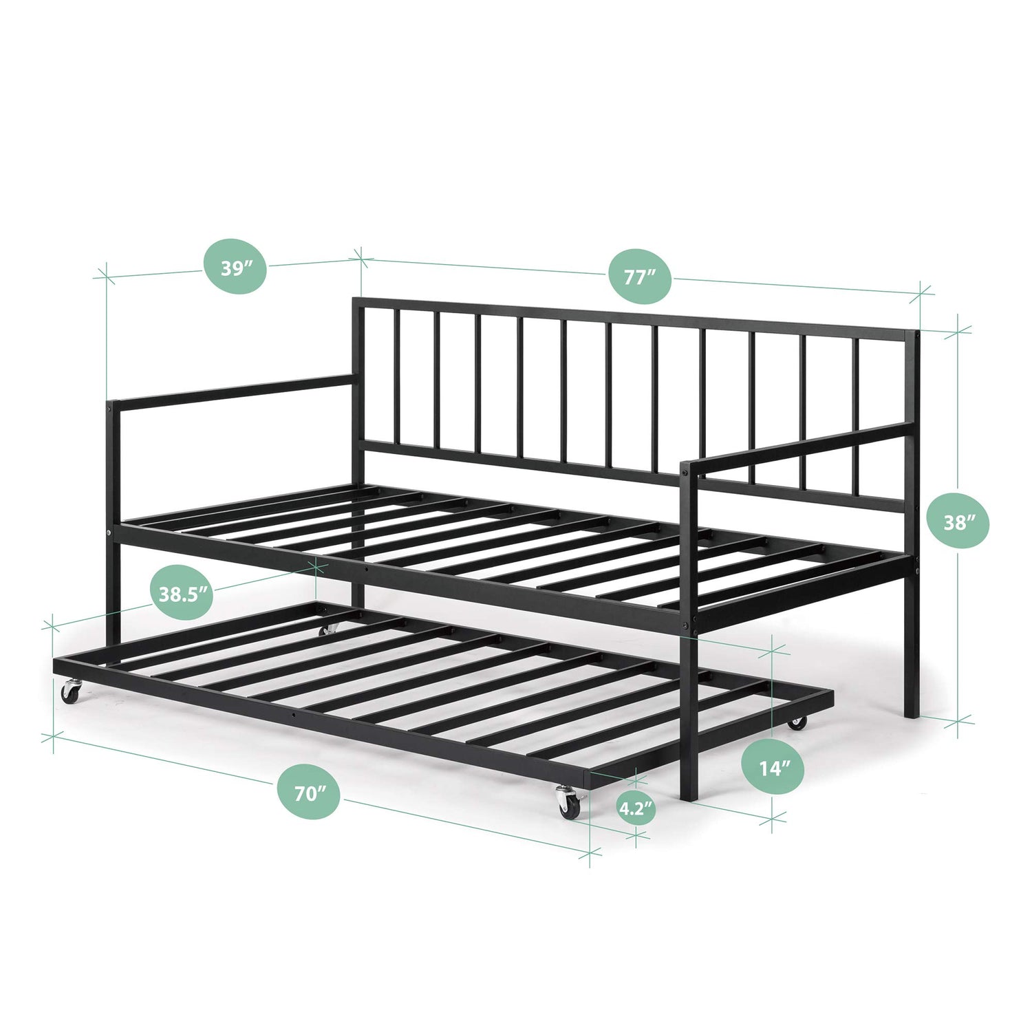 Details: Enjoy extra sleeping space and additional seating with the Zinus Eden Daybed and trundle set. The stylish metal frame will complement any decor and is made from premium steel for the best support. Use the trundle for extra sleeping space and roll away under the daybed during the day. Fits two Twin mattresses (not included). Designed for extra seating or an extra bed, this platform daybed features a convenient trundle that tucks away when not in use. This bed includes a steel platform that your mattress can rest directly on top of, no box spring needed. And just like all of our beds, this practical daybed ships with all the tools and instructions you need to assemble it with complete confidence. Whether you’re using it for entertaining friends or just some much-needed rest and relaxation, the Eden Daybed with Trundle is built with boundless levels of style and practicality for any room in need of a little more comfort.