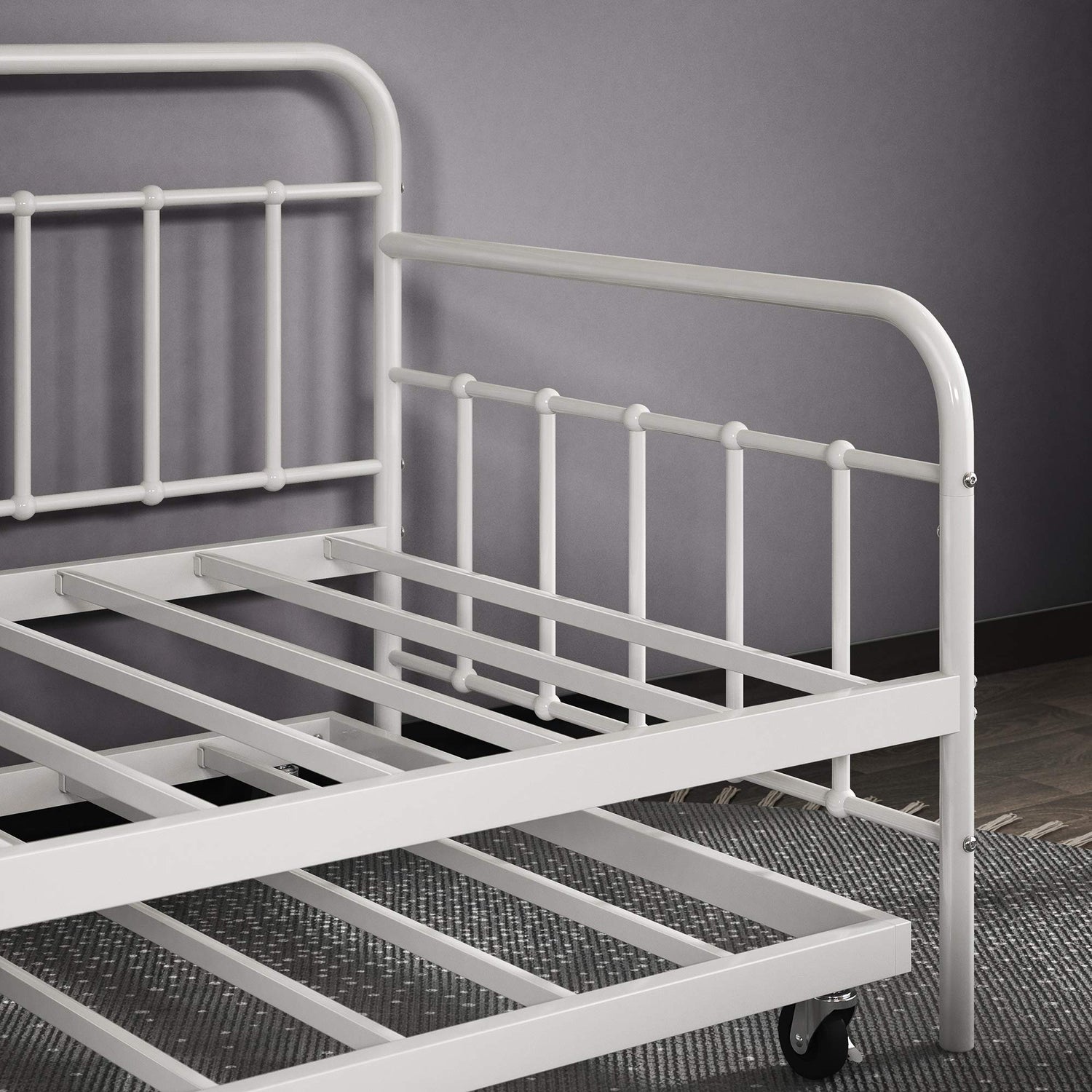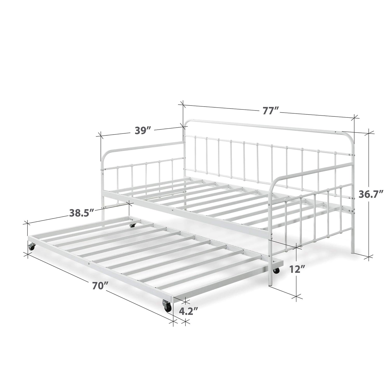Details: Enjoy extra sleeping space and additional seating with the Zinus Florence Twin Daybed and trundle frame set. The stylish white metal curved frame will complement any décor and is made from premium steel for the best support. Use the trundle for extra sleeping space and roll away under the Daybed during the day. Fits two Twin mattresses (not included). another comfort innovation from Zinus.