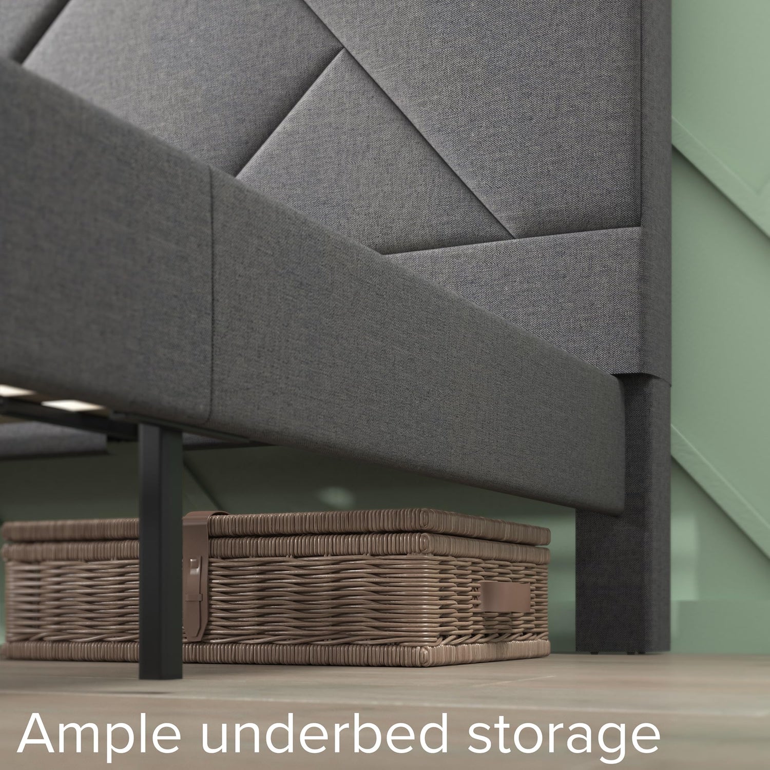 - MODERN STYLE, EARTH-FRIENDLY WONDERBOX (TM) - Featuring an asymmetrical upholstered headboard, cozy foam padding and muted grey tone, this platform bed is shipped in a box designed to leave a smaller carbon footprint