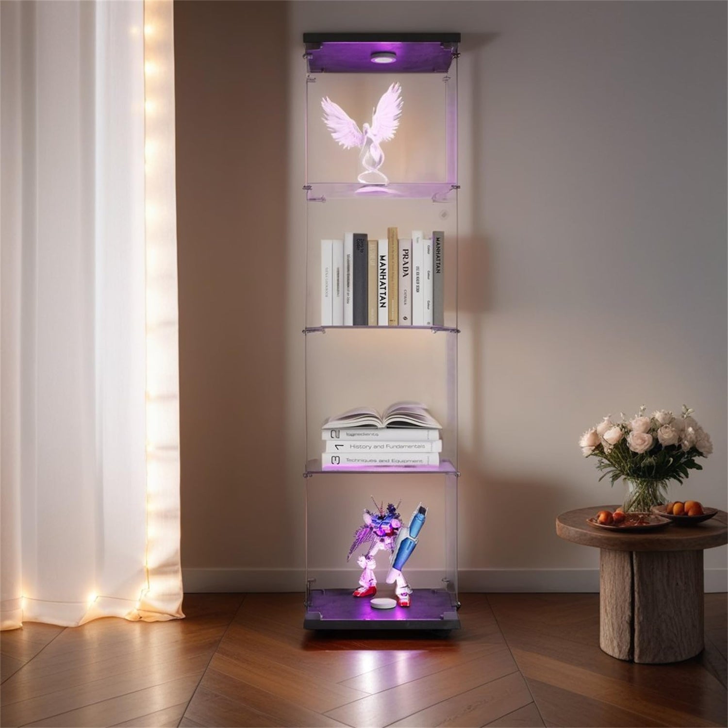 Features: Lockable with Keys: There is a lock with 2 keys on the top of the glass display case which will keep safe of your collections Display Cabinet with Lights: The glass display cabinet came with 2 lights 12 colors and a remote control to to adjust brightness and color Sufficient Storage Space: This glass display cabinet with 4 shelves and you can store action figures collections dolls jewelry with this glass antique cabinet, the glass door helps prevent dust from entering and protects your collection well. Enhanced Protection: This display cabinet is made of tough tempered glass and solid wood particle board, sturdy and durable with a solid structure Modern Design Showcase: Frameless transparent design, clearly shows your favorite action figure, books, toys, dolls, liquor, and jewelry with this glass display case Quick Install: Our glass display case has been upgraded, with many spare parts in accessory packs and instructions, making it easier to assemble. \