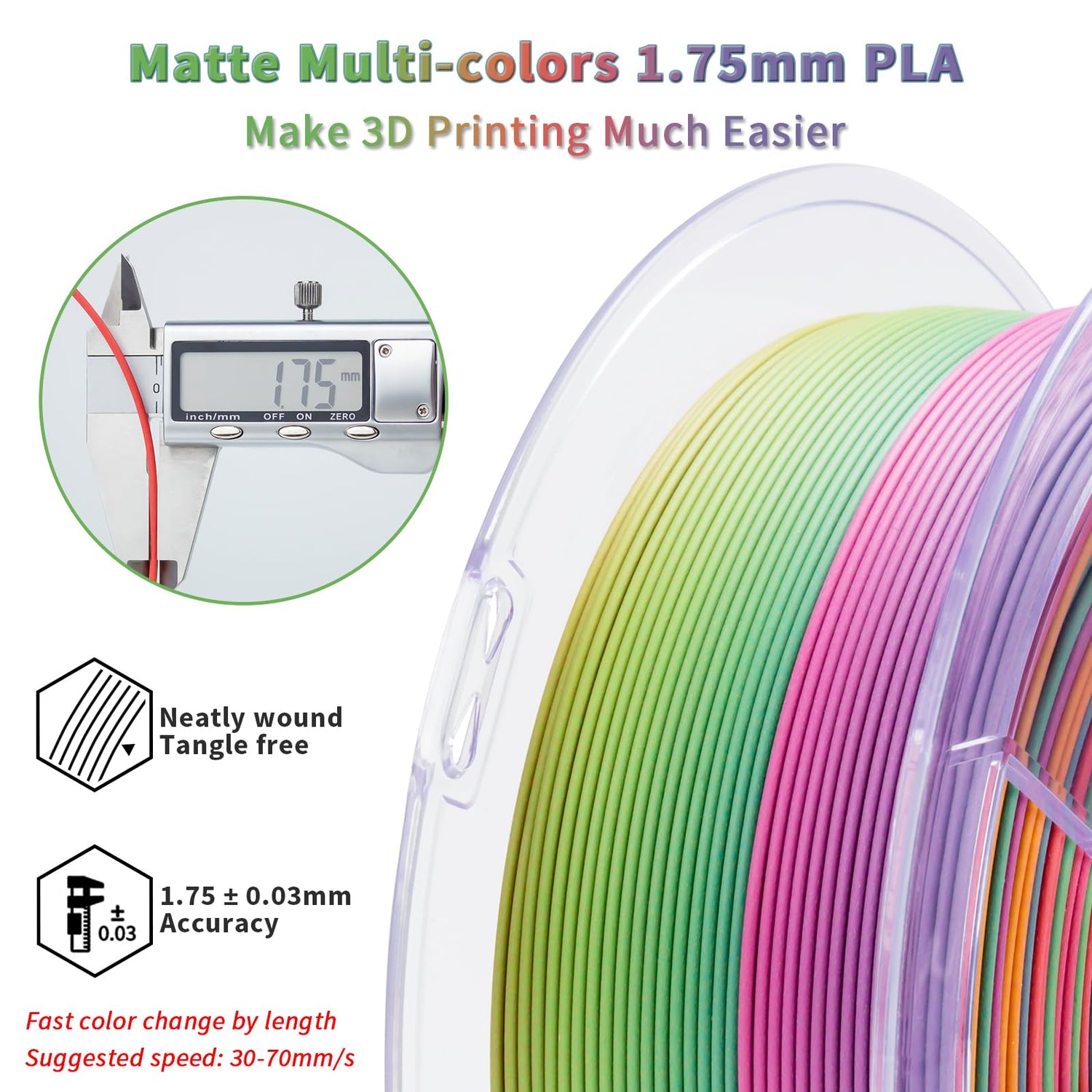 - [Fast Color Change Matte PLA]- The ZIRO "Rainbow Blaze" combined multiple colors in one matte pla filament. Higher-cost production technology to achieve the true faster color changing aim. The matte surface offers a no shine look, giving your 3D works a unique style.