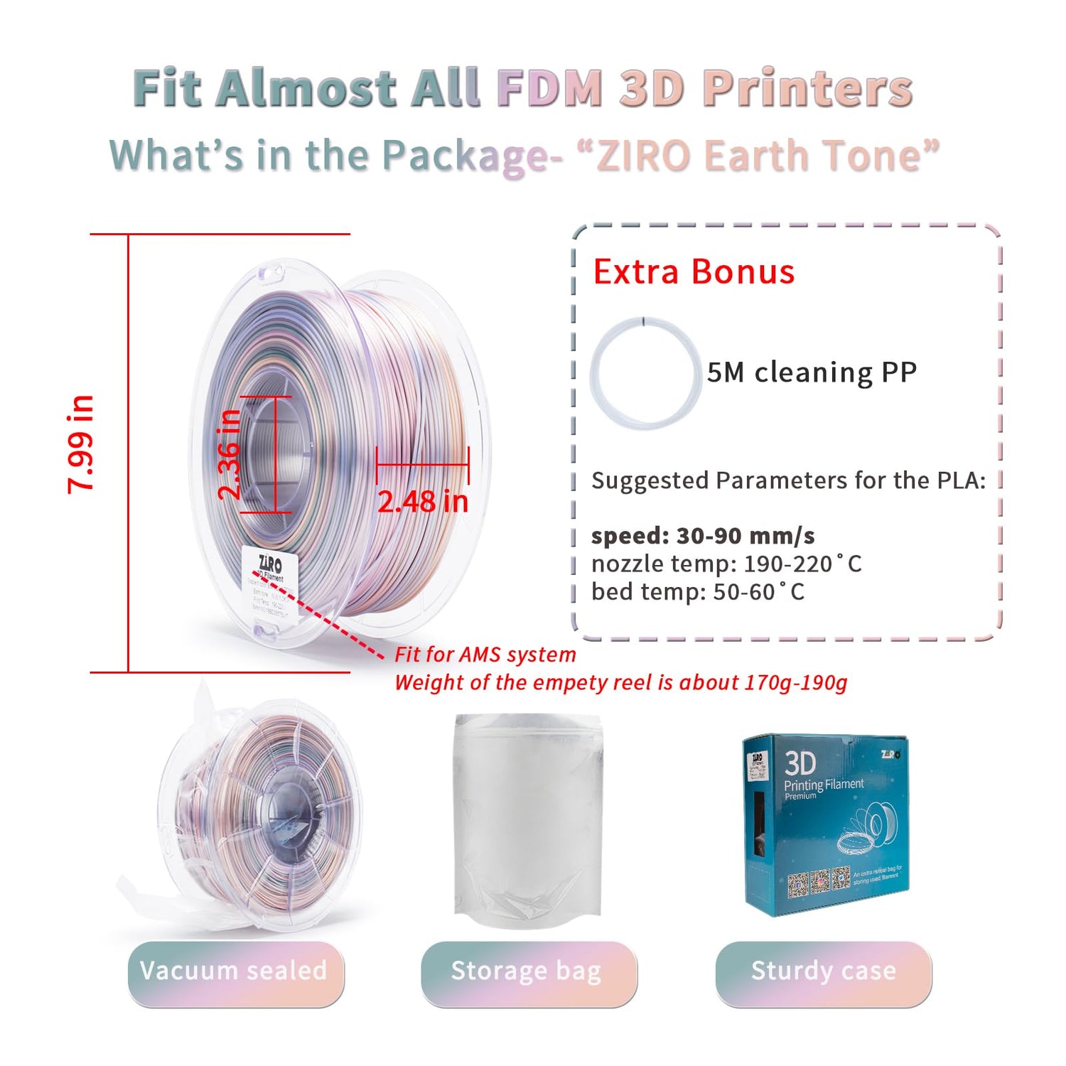 - [Fast Color Change Silk PLA]- The ZIRO "Earth Tone" combined multi-colors in one shiny PLA base. Higher-cost production technology to achieve the faster color changing aim. The silky surface offers a shiny, glossy look, giving your 3D works a luxury style.(Color changing speed please reference our model weight mark in picture)