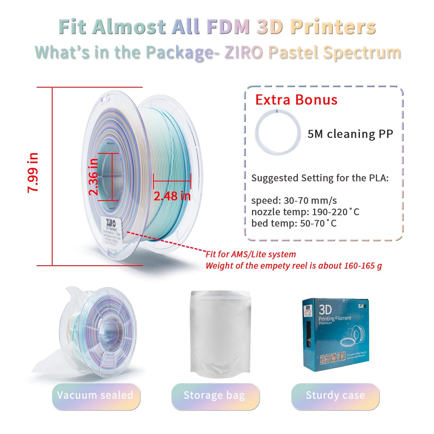 - [What You Will Get]- 2.2 lbs Pastel Spectrum + a free reseal bag + a 5M cleaning filament. If you are looking for amazing color design PLA, the ZIRO Pastel Spectrum is your go-to choice.