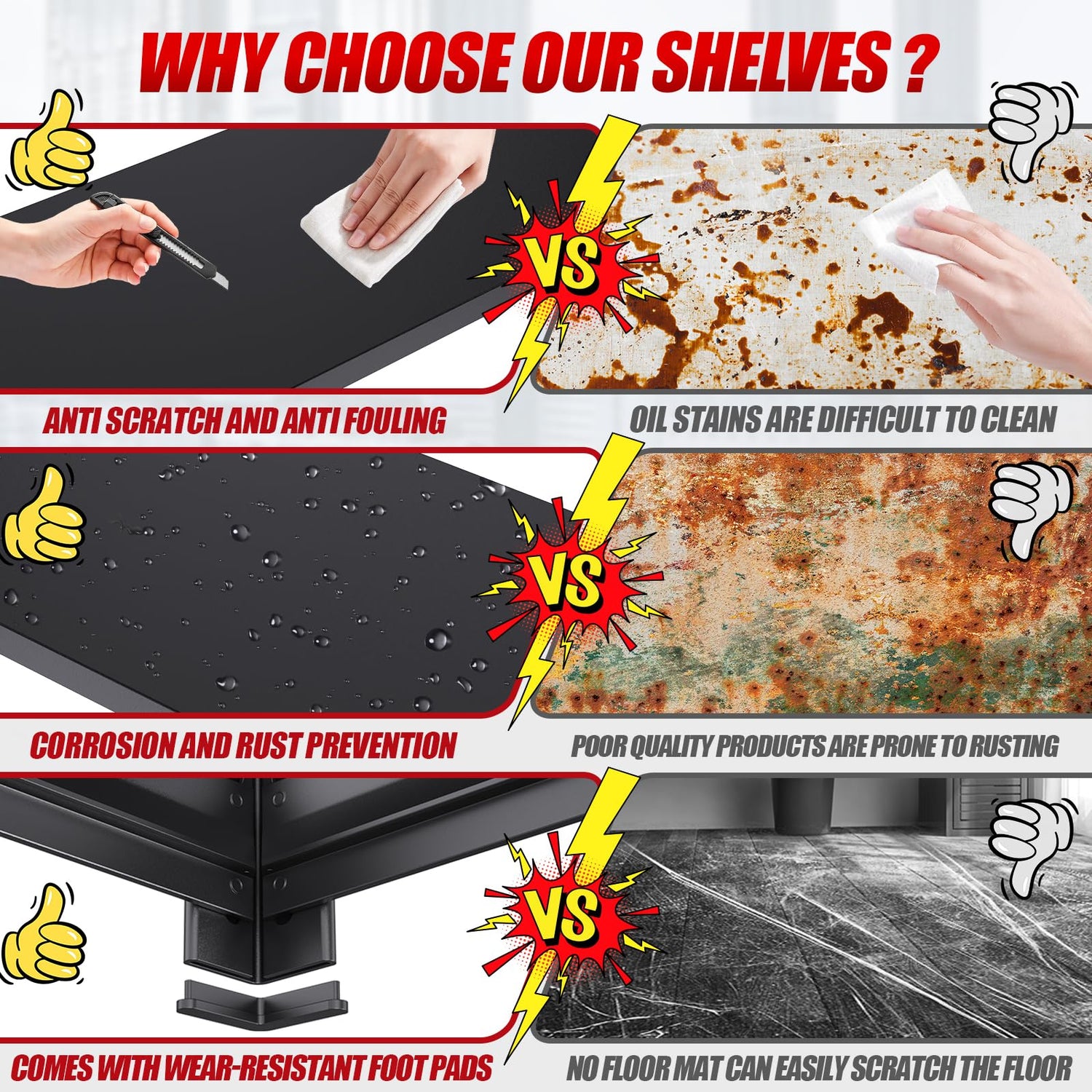 • 【Premium Metal Construction】This garage shelving is made from top-grade rust-resistant steel, specifically engineered for the demands of garage storage shelves. As a durable metal shelving solution, its surface features phosphating and powder coating to fight moisture, dirt, and wear—common in garage environments. Unlike cheap metal shelf alternatives, this garage shelving stays rust-free and easy to clean (just wipe with a damp cloth), making it a long-lasting choice for anyone needing reliable shelving in their garage.