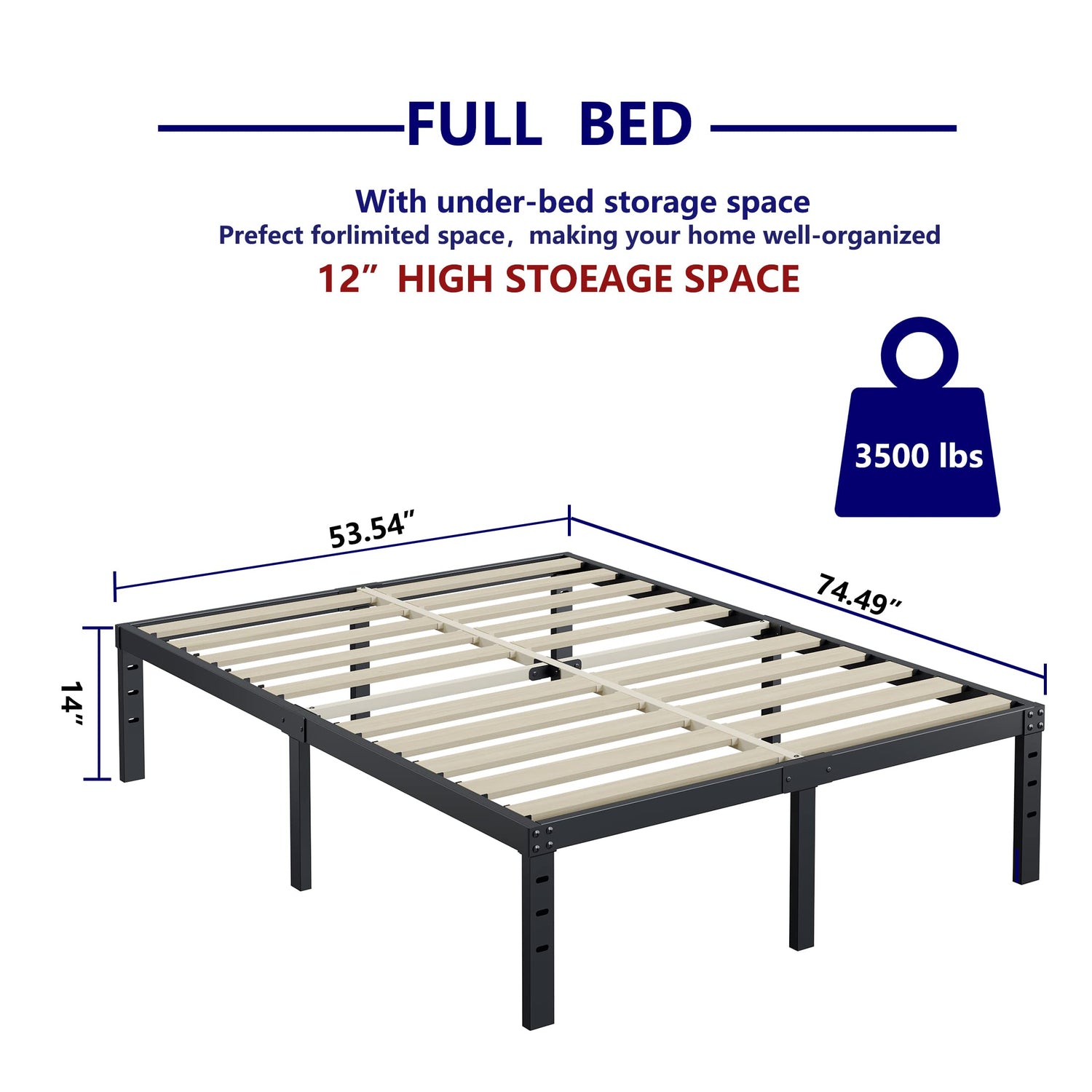 ZIYOO Full Size Bed Frame 14 Inches High 3 Inches Wide Wood Slats with 3500 Pounds Support for Foam Mattress, No Box Spring Needed, Underbed Storage Space,Easy Assembly, Noise Free