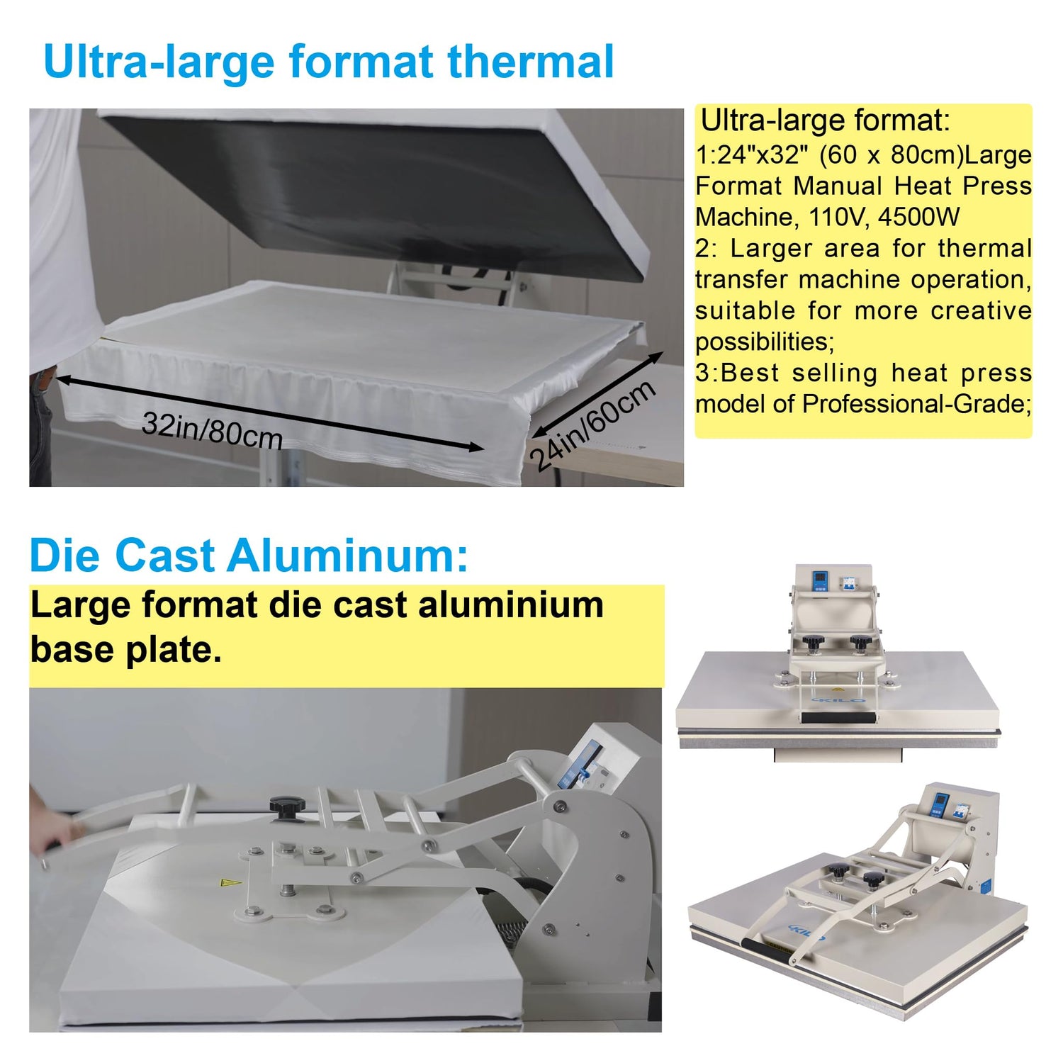 - Large Format & High Power:The 24x32 Manual Heat Press Machine (110V, 4500W) is perfect for large-area heat transfers and sublimation. With a generous 24" x 32" (60 x 80 cm) heat plate, it handles larger projects with ease. This powerful machine, featuring a 4500W heating element, ensures even heat distribution for consistent, high-quality results. Its user-friendly design, with a sliding heat plate head and ergonomic construction, allows for easy operation and smooth pressing. Ideal for professionals and high-volume use, it delivers reliable performance and excellent results every time.