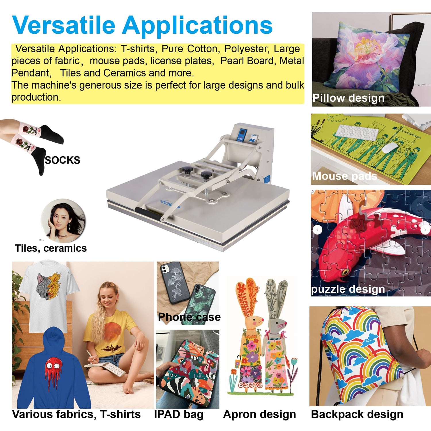 - Versatile Applications: Perfect for heat transfer and sublimation on various materials, including t-shirts, fabrics, banners, mouse pads, ceramic tiles, and more. This heat press machine is designed to meet the needs of small businesses, high-volume production facilities, Shops, home workshops and design studios.