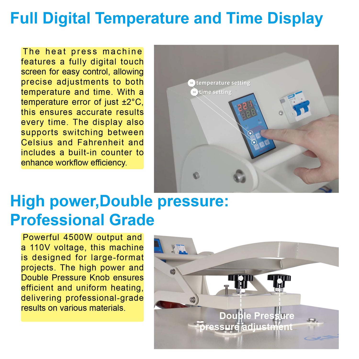 - Double pressure rod and Double spiral button structure: This heat press machine features a dual pressure rod and dual spiral button structure for more precise and uniform pressure adjustment. The pressure can be easily fine-tuned, ensuring optimal contact between the upper and lower plates, which results in better pressing effects. The high-accuracy signal indicator alerts when the pressing process is complete. The heating plate uses advanced ultra-precision wire tube technology, ensuring consistent temperature distribution and balance. The pressure is adjusted through a connecting rod, which offers a wide adjustment range with low torque, allowing for easy and precise control.