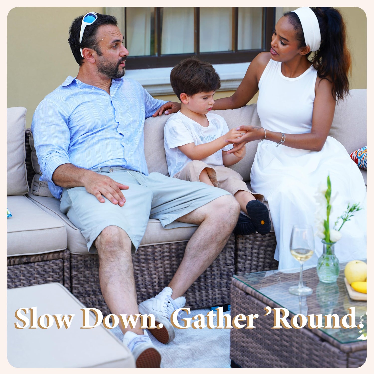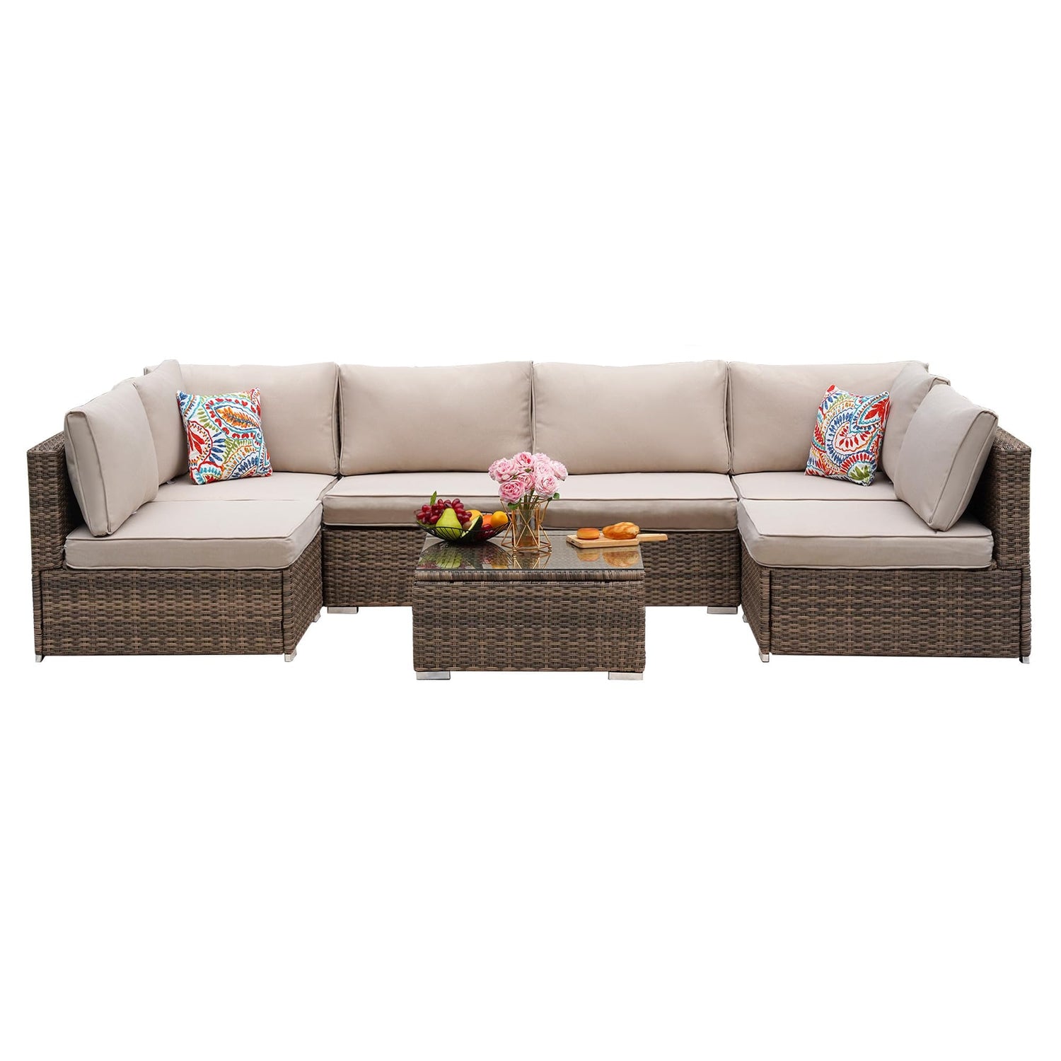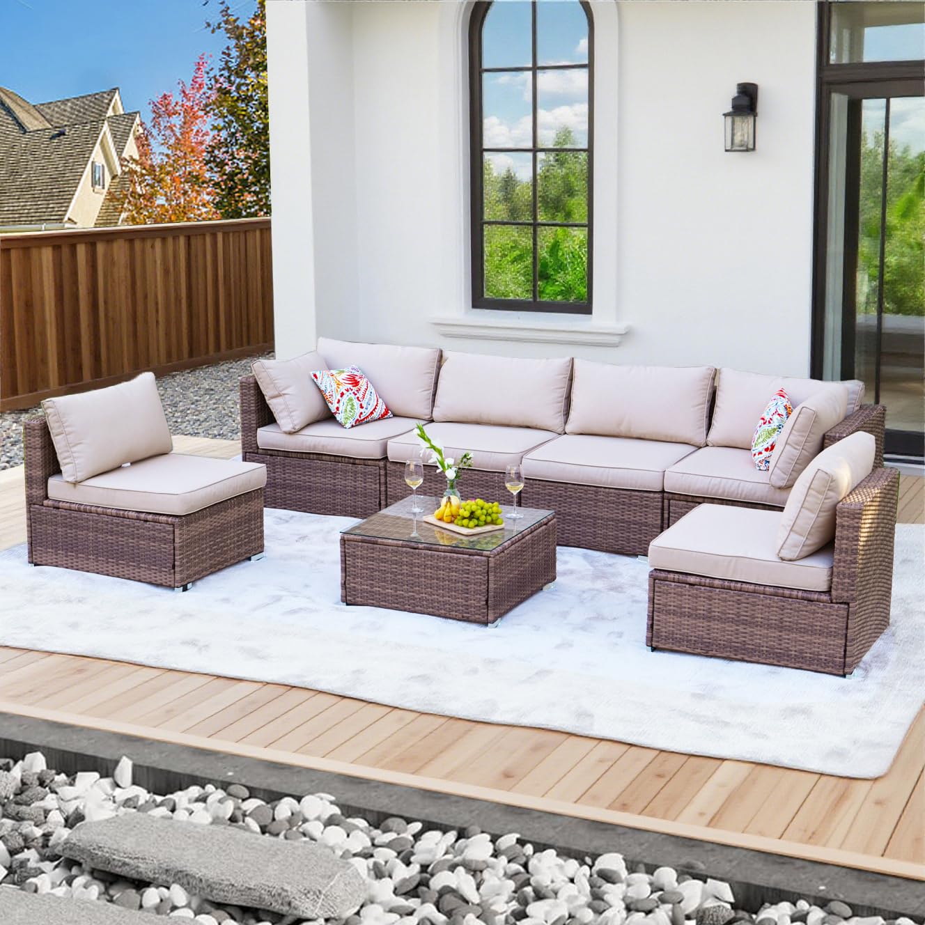 ZJEYEJZ 7 Pieces Patio Furniture Set - All-Weather Outdoor Wicker Sectional Conversation Sofa, Rattan Patio Seating Sofa Set with Cushion and Glass Table for Porch Poolside, Brown/Beige