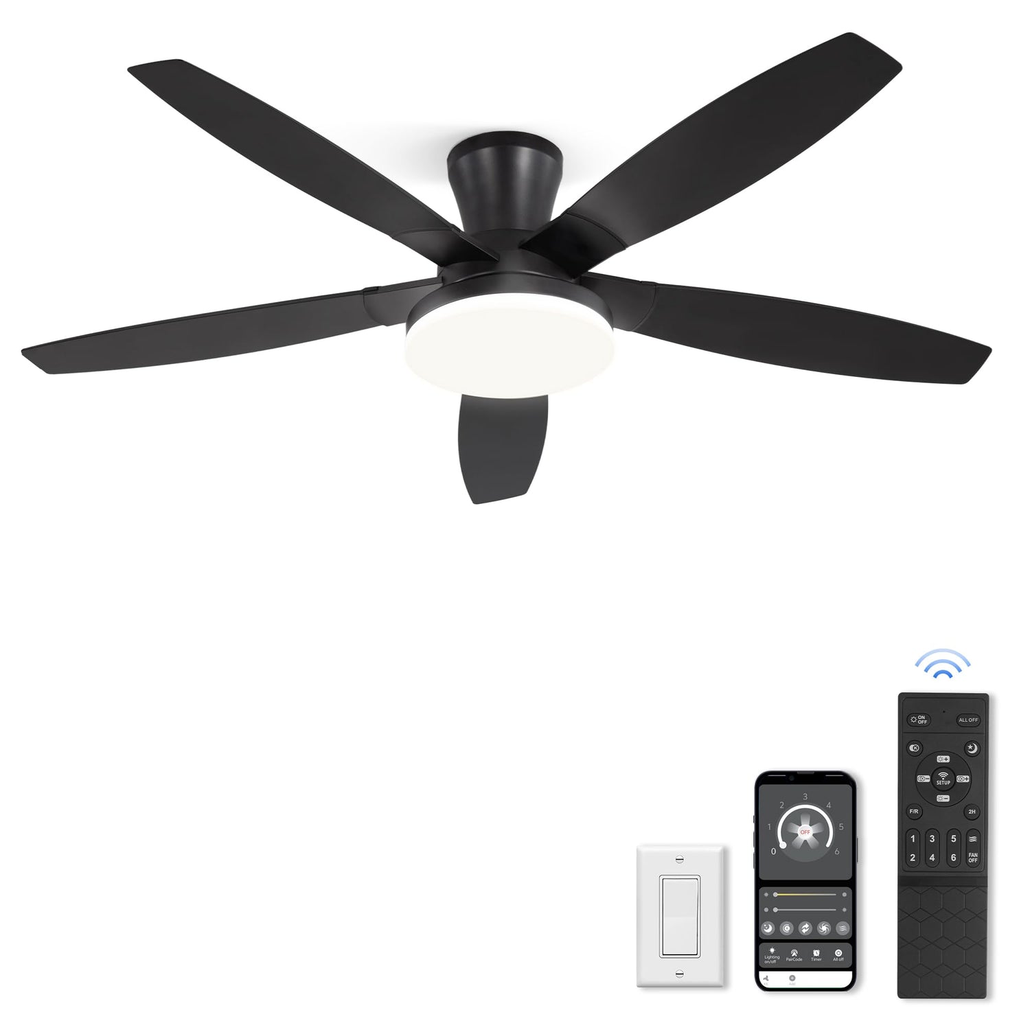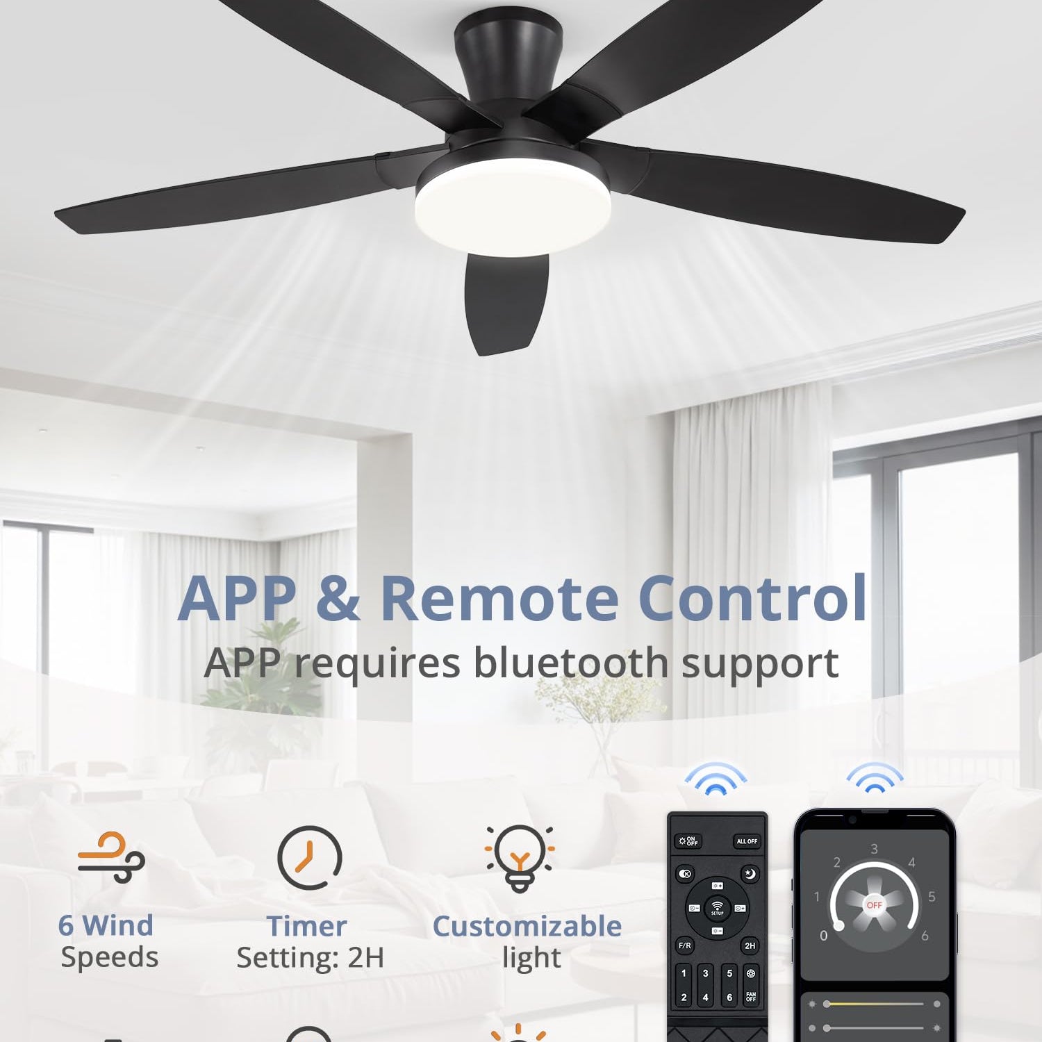 - Ceiling Fans with lights: Our 52 inch ceiling fan has both remote control and APP control. Effortlessly adjust 6-speed settings, dim the light to your preference, or set a convenient 2-hour auto-off timer for energy savings