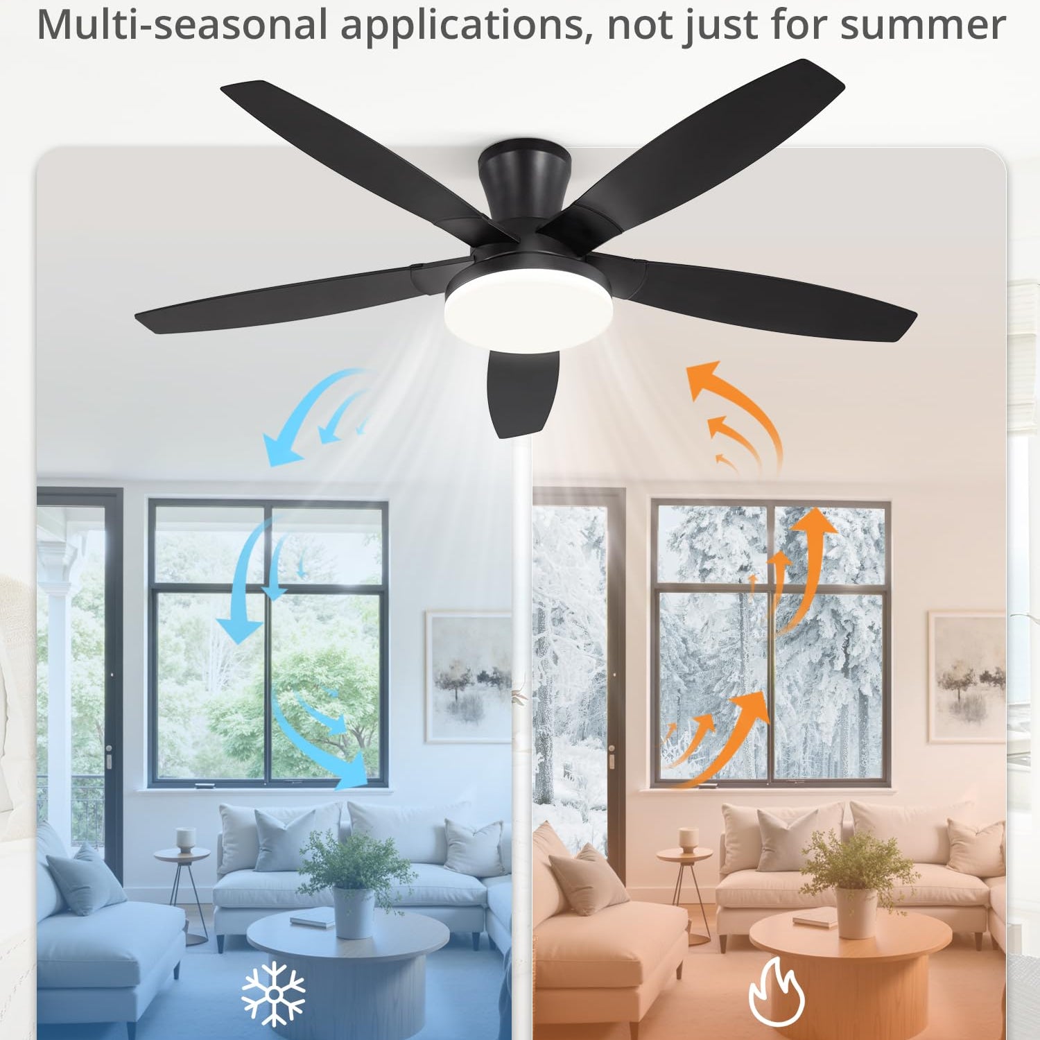 - Reversible DC motor:Engineered with a high-efficiency DC motor, the flush mount ceiling fan delivers powerful yet ultra-quiet airflow. Sending cool wind downward in summer and optimizing air circulation in winter—making it a year-round home essential