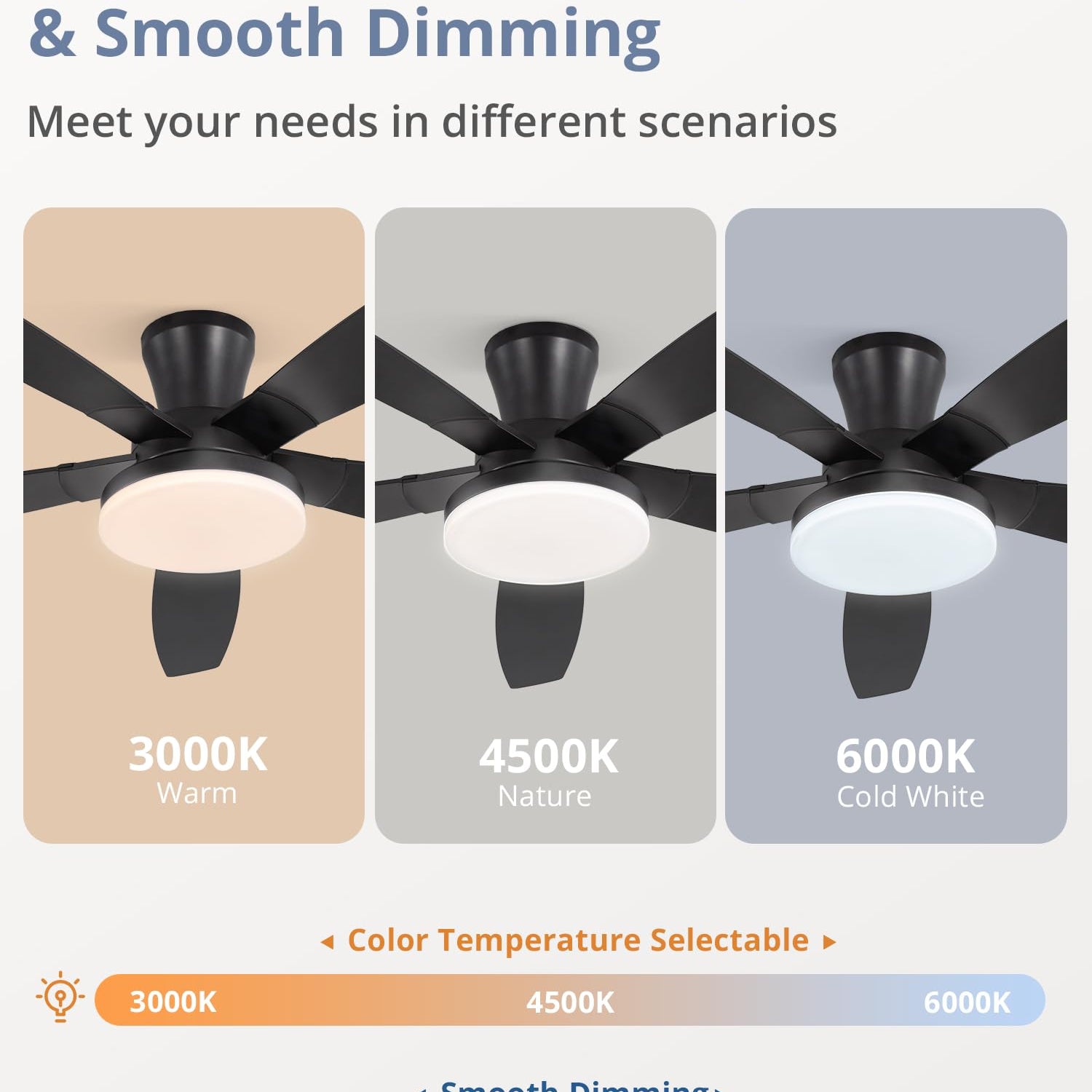 - Customizable light: Our smart ceiling fan can personalize your space with smooth dimming (10%-100%) and 3 adjustable color temperatures (3000K–6000K). The 24W wide LED panel ensures brightness, even illumination perfect for any activity or mood