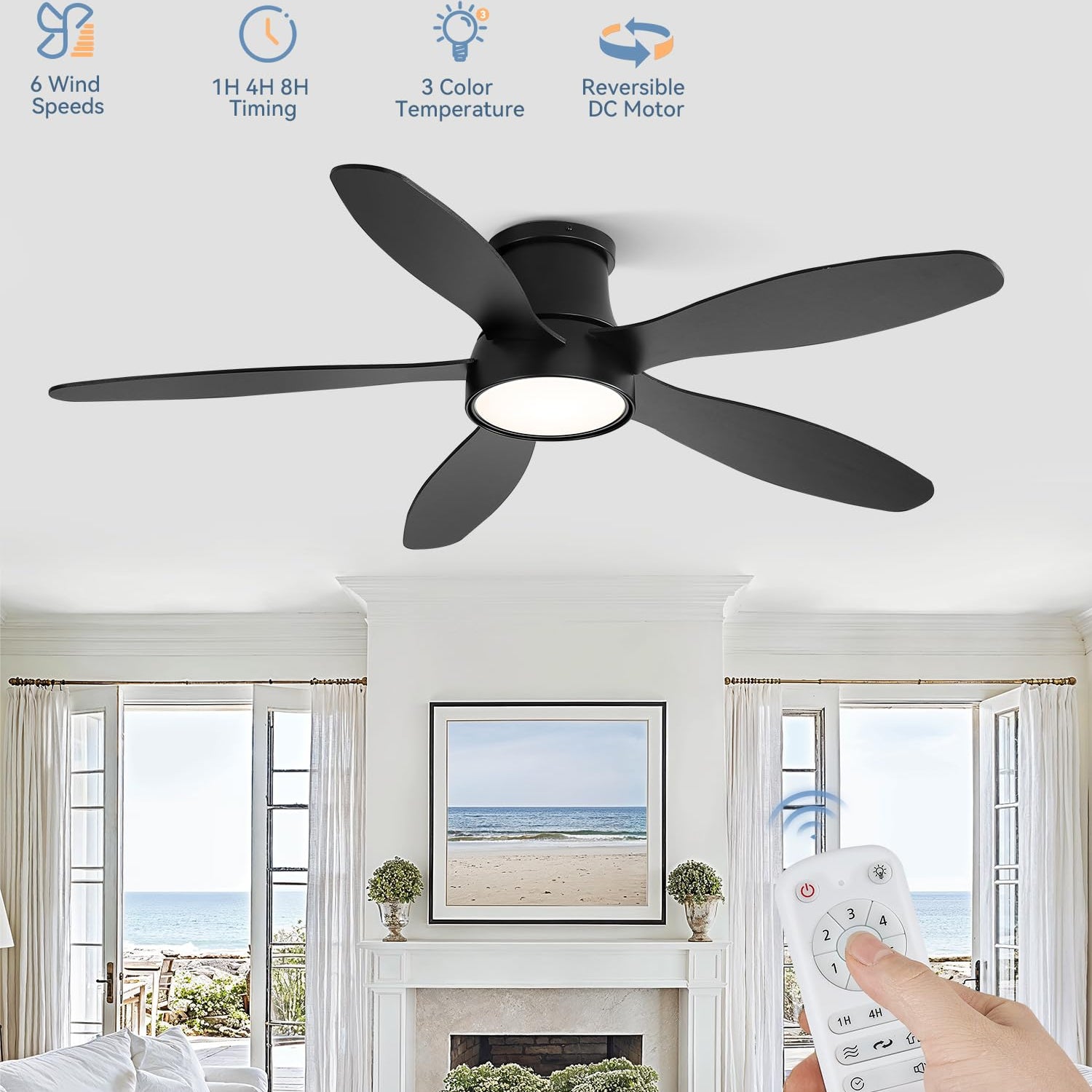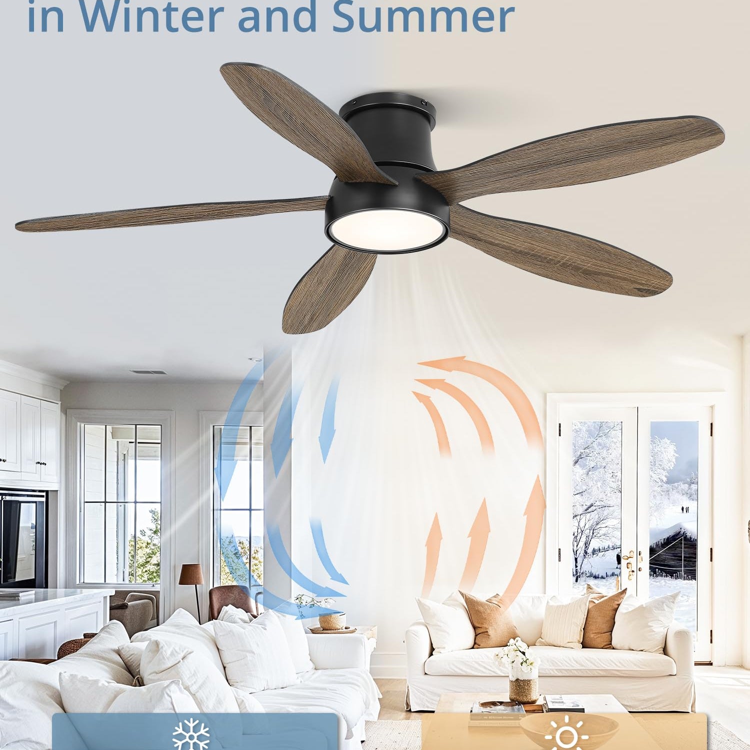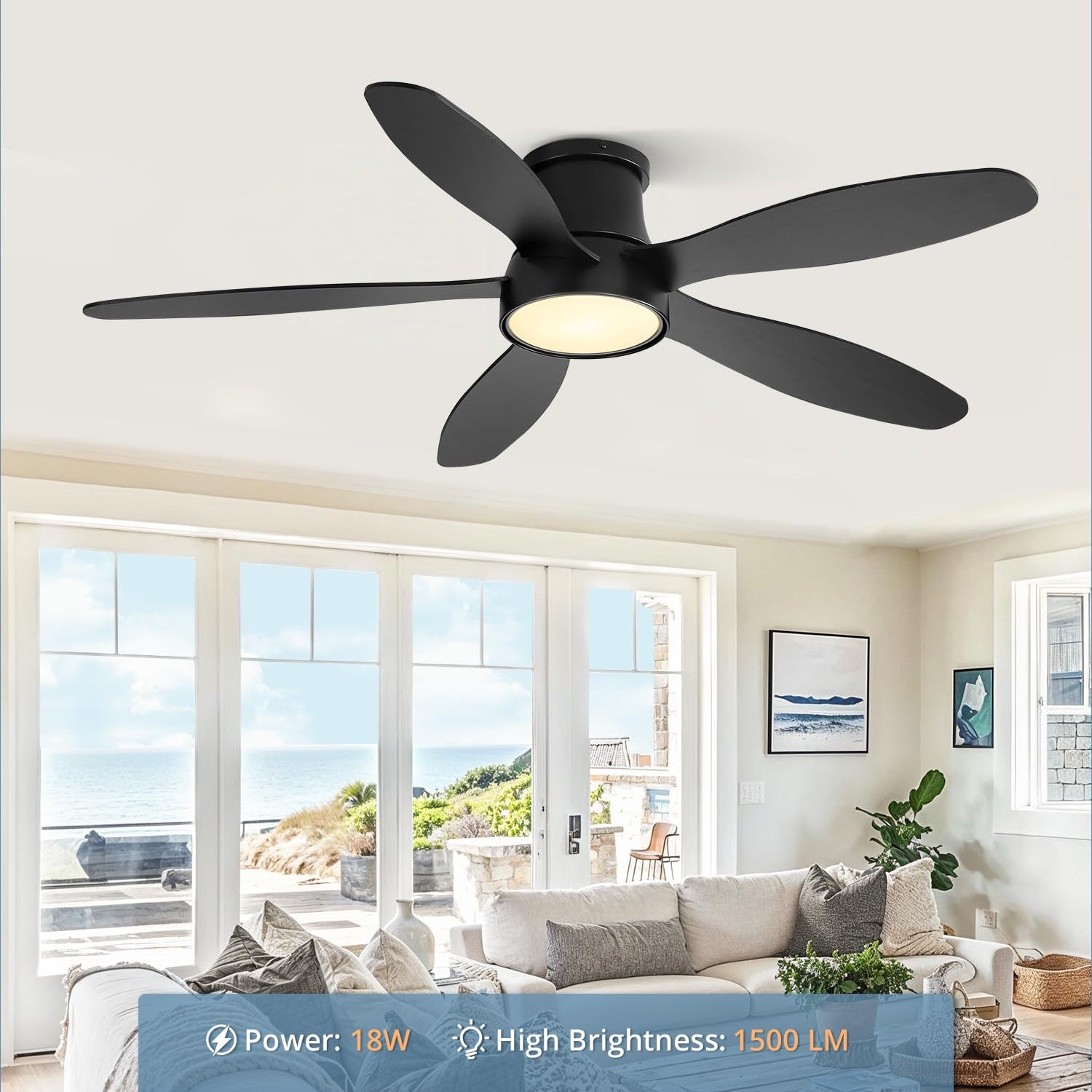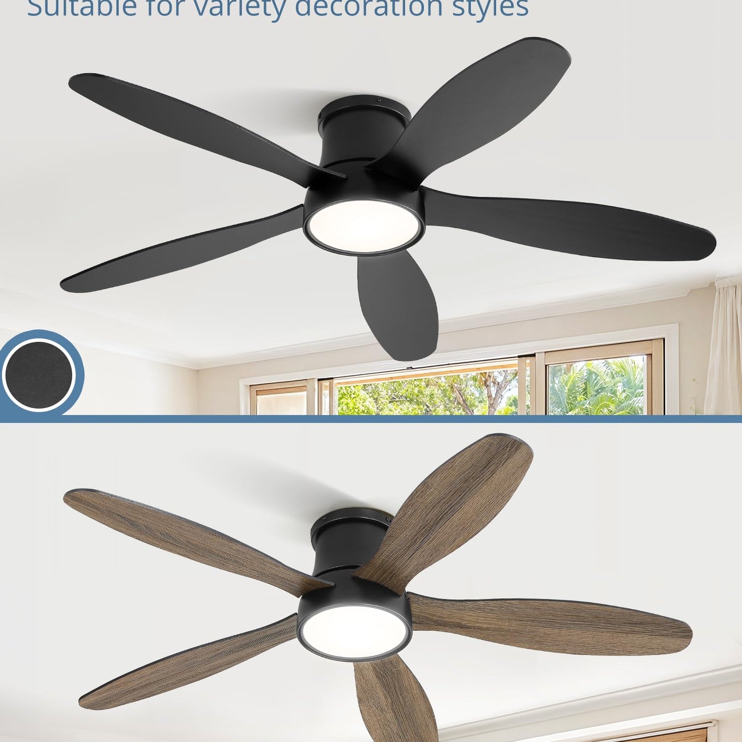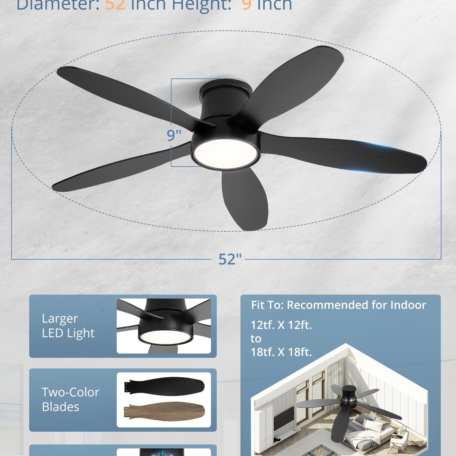 ZMISHIBO 52 Inch Ceiling Fans with Lights, Flush Mount Low Profile Ceiling Fan with Remote, Reversible, 3CCT, Noiseless, LED Ceiling Fan Lighting Fixture for Bedroom, Kitchen, Indoor-Black