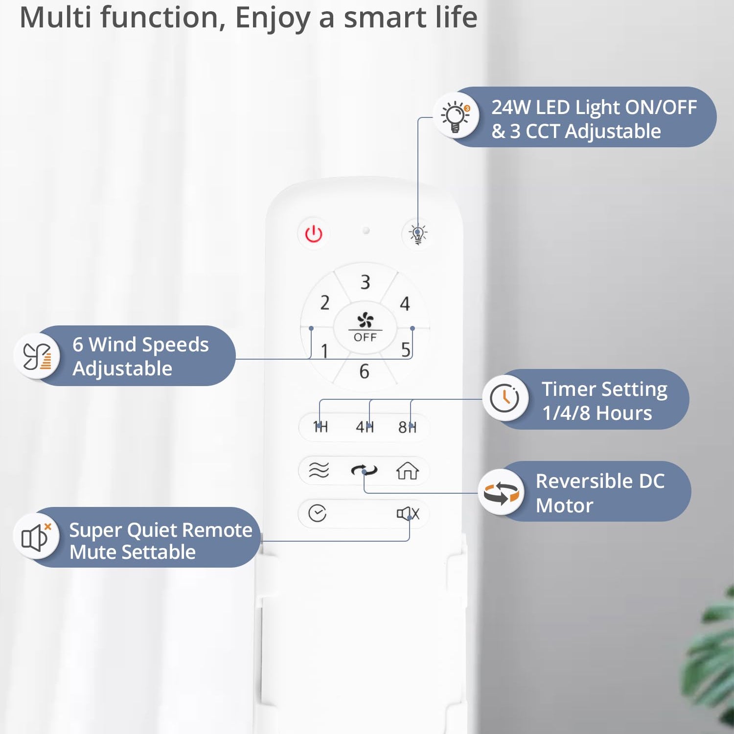 - Convenient Multi-Function Remote: Simplify your life with the included multi-function remote control. Easily adjust the fan and 24W led light settings to your preference. Turn the light/fan on/off, choose from 3 color temperature options(3000K/4500K/6000K), adjust fan rotation direction, select the ideal fan speed, and even set a timer(1/2/4H) – all at your fingertips