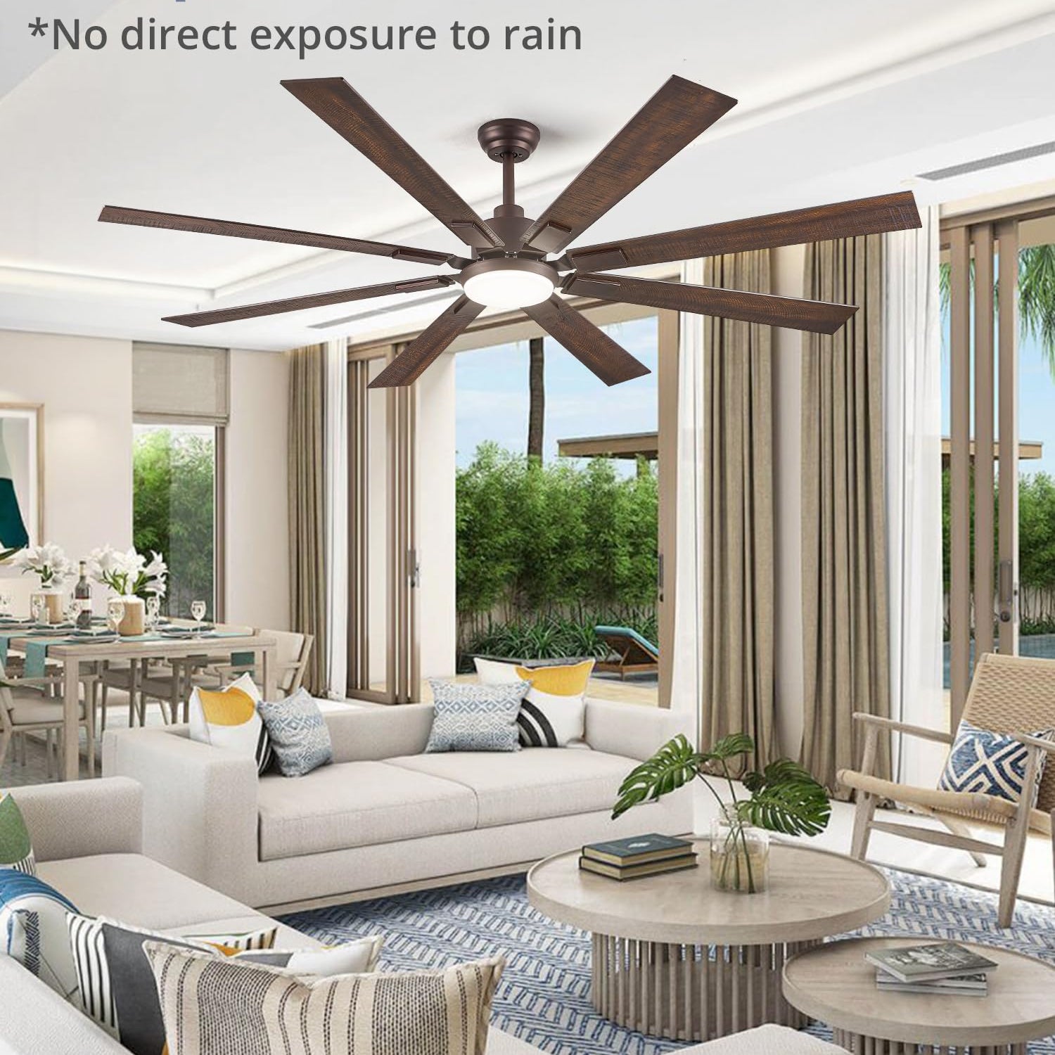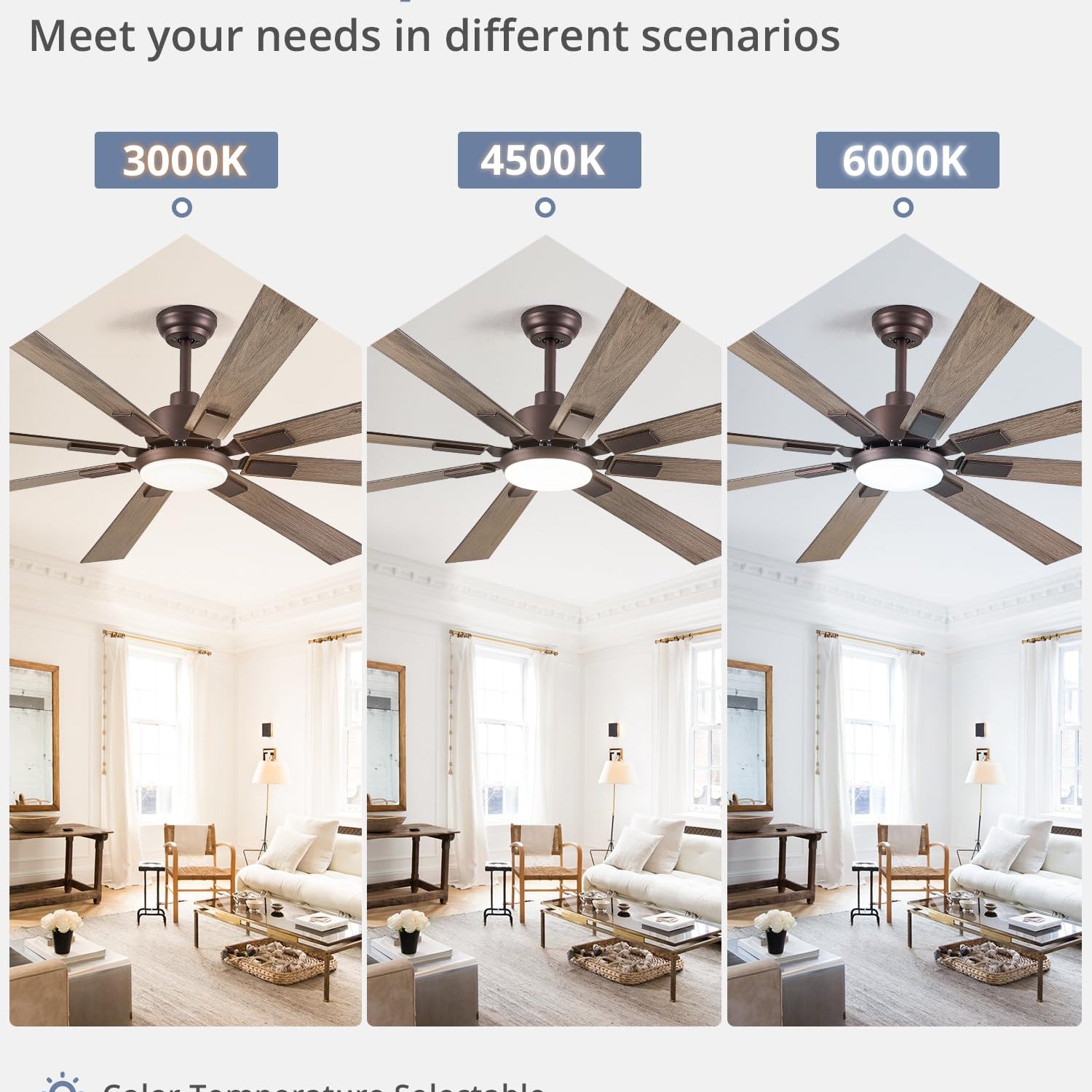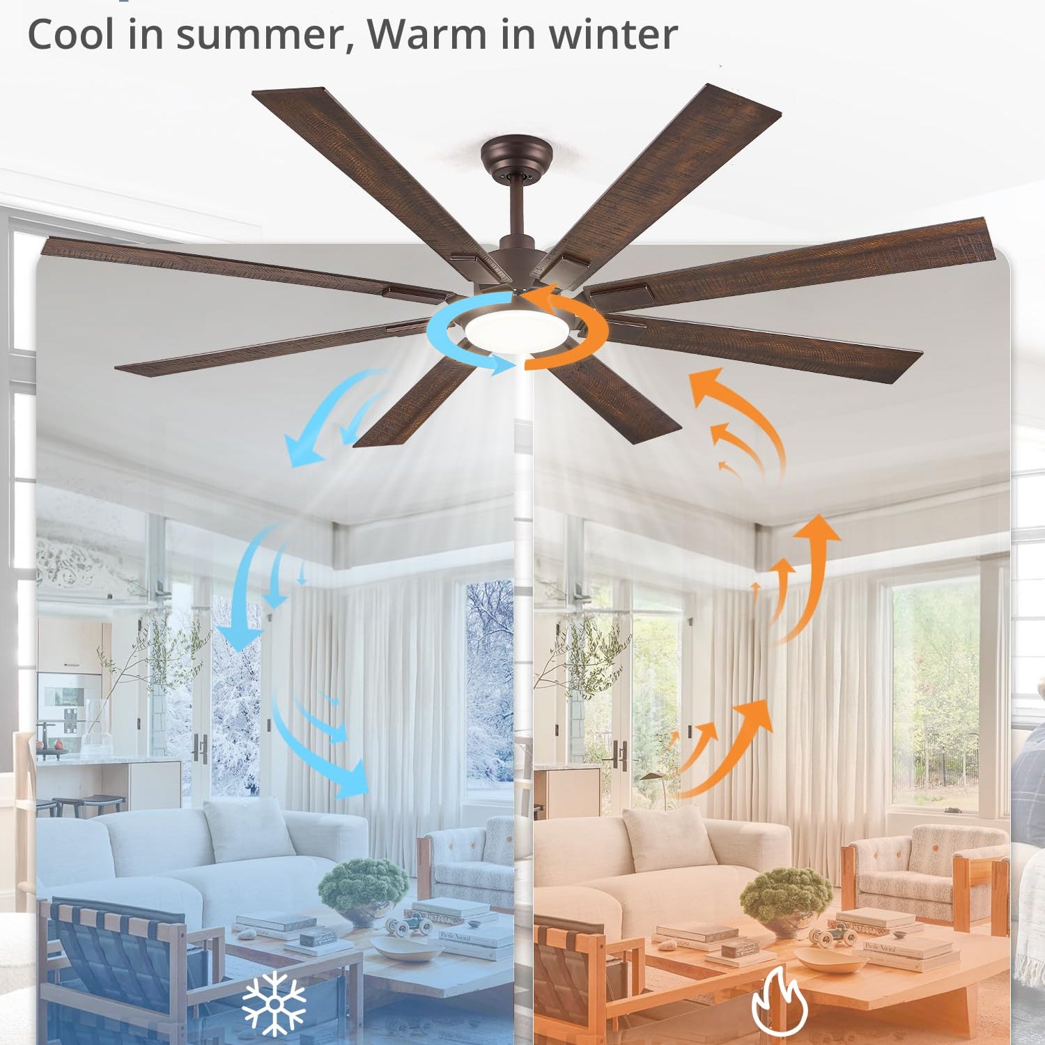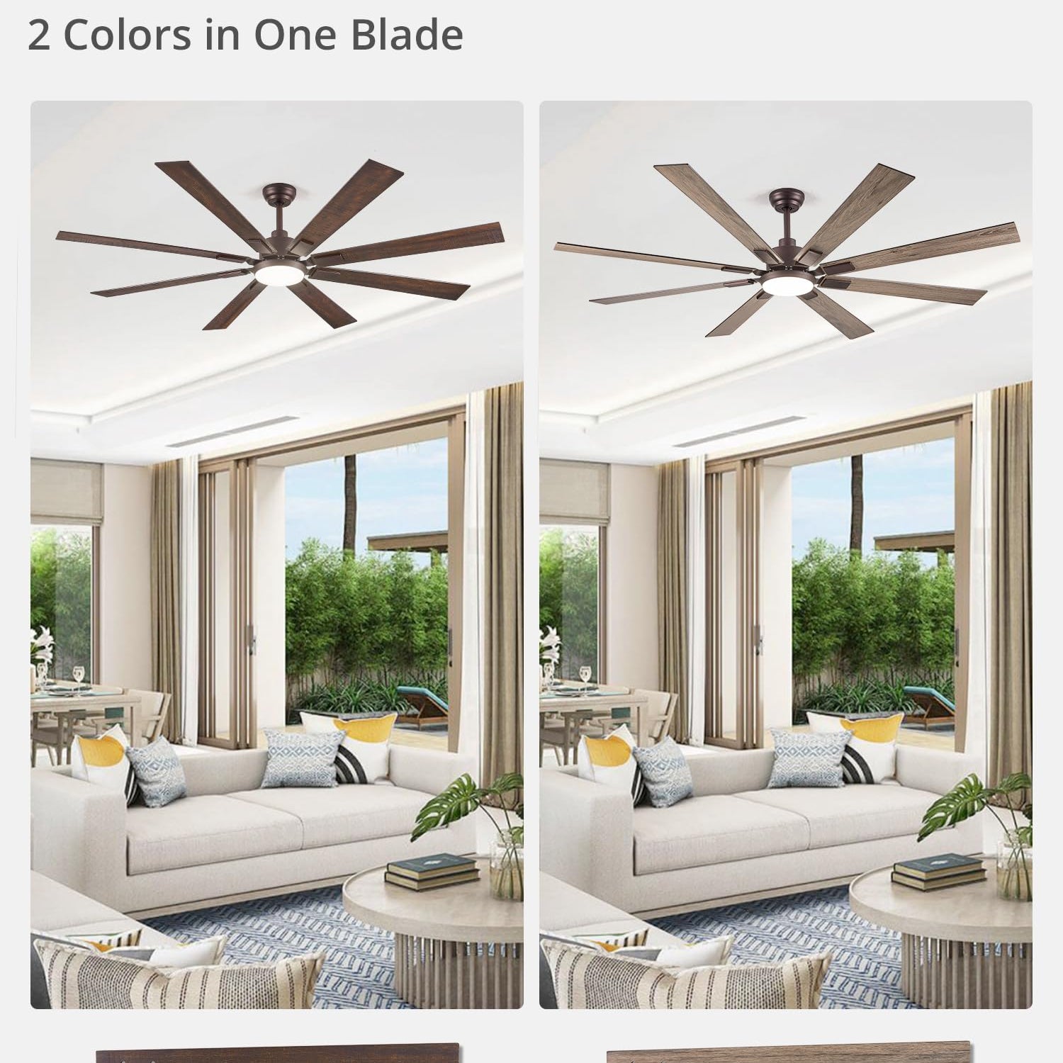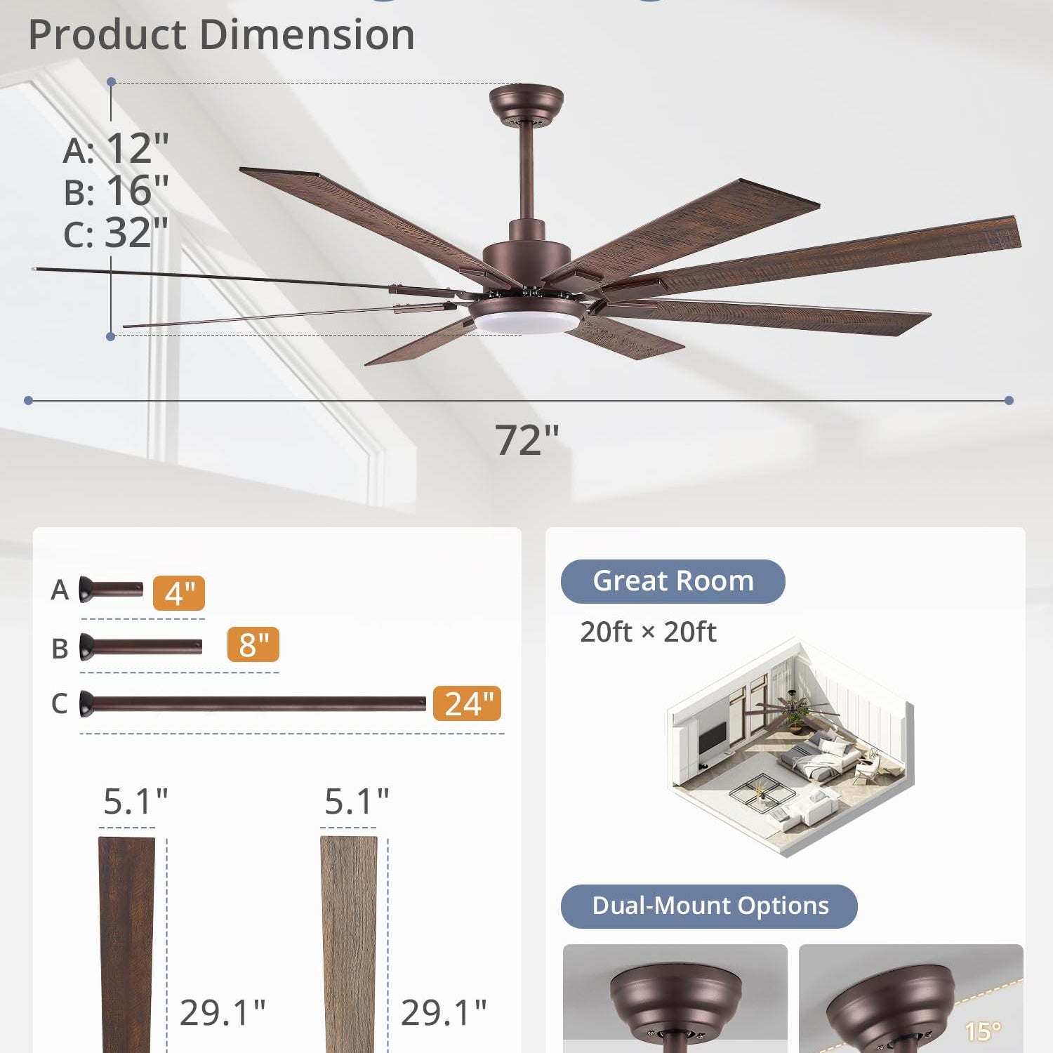 - 72 inch ceiling fan: This large ceiling fan includes 4“, 8”, and 24“ down rods, making it a versatile choice for both low and high ceilings (12-32 inches high). Its stylish fan blades feature a sleek dual-color design in broze and light oak, perfectly blending farmhouse and modern styles. With 8 fan blades, the big ceiling fan offers a cost-effective and eye-catching solution, replacing the need for multiple smaller ceiling fans. Ideal for living room, garage, barn, or covered patio