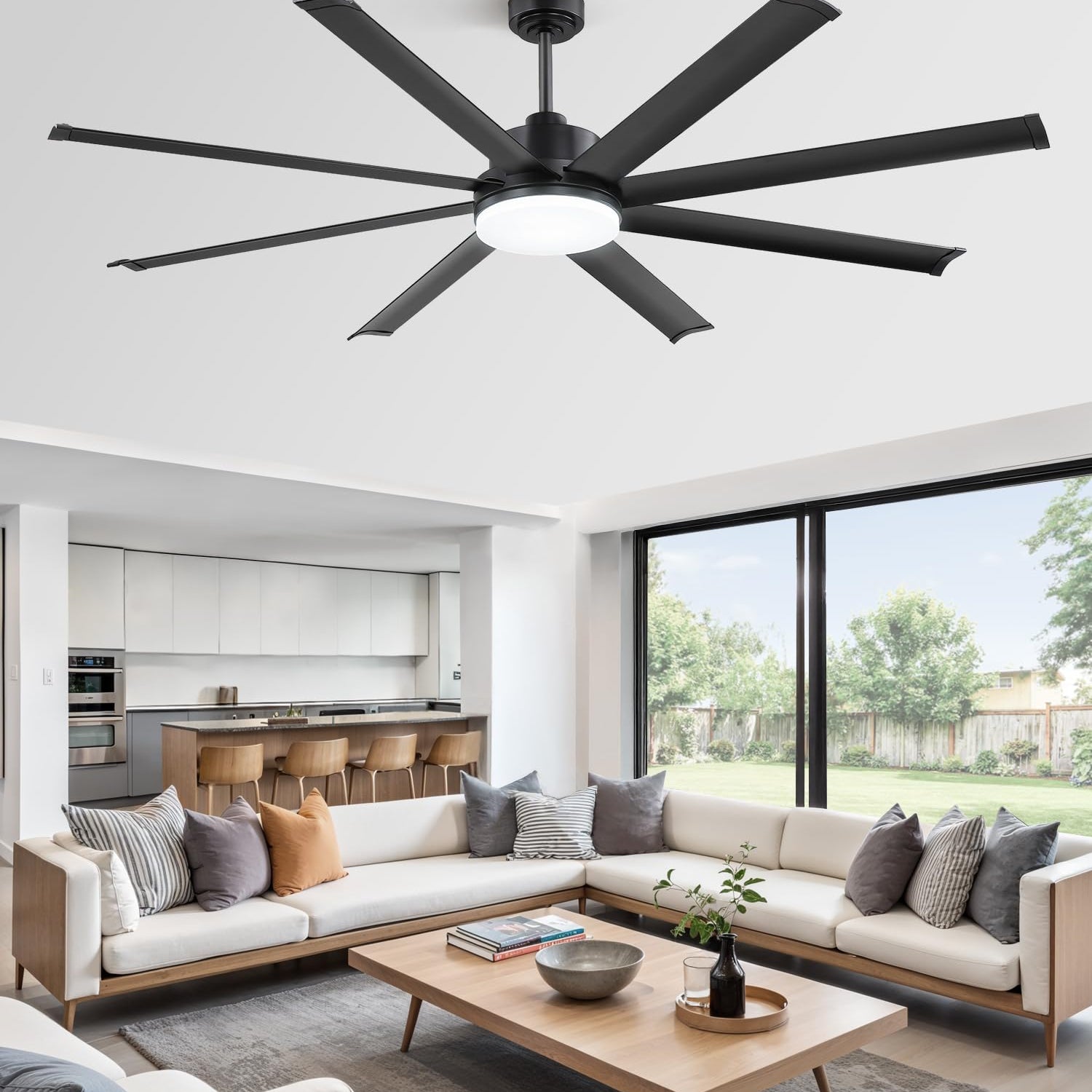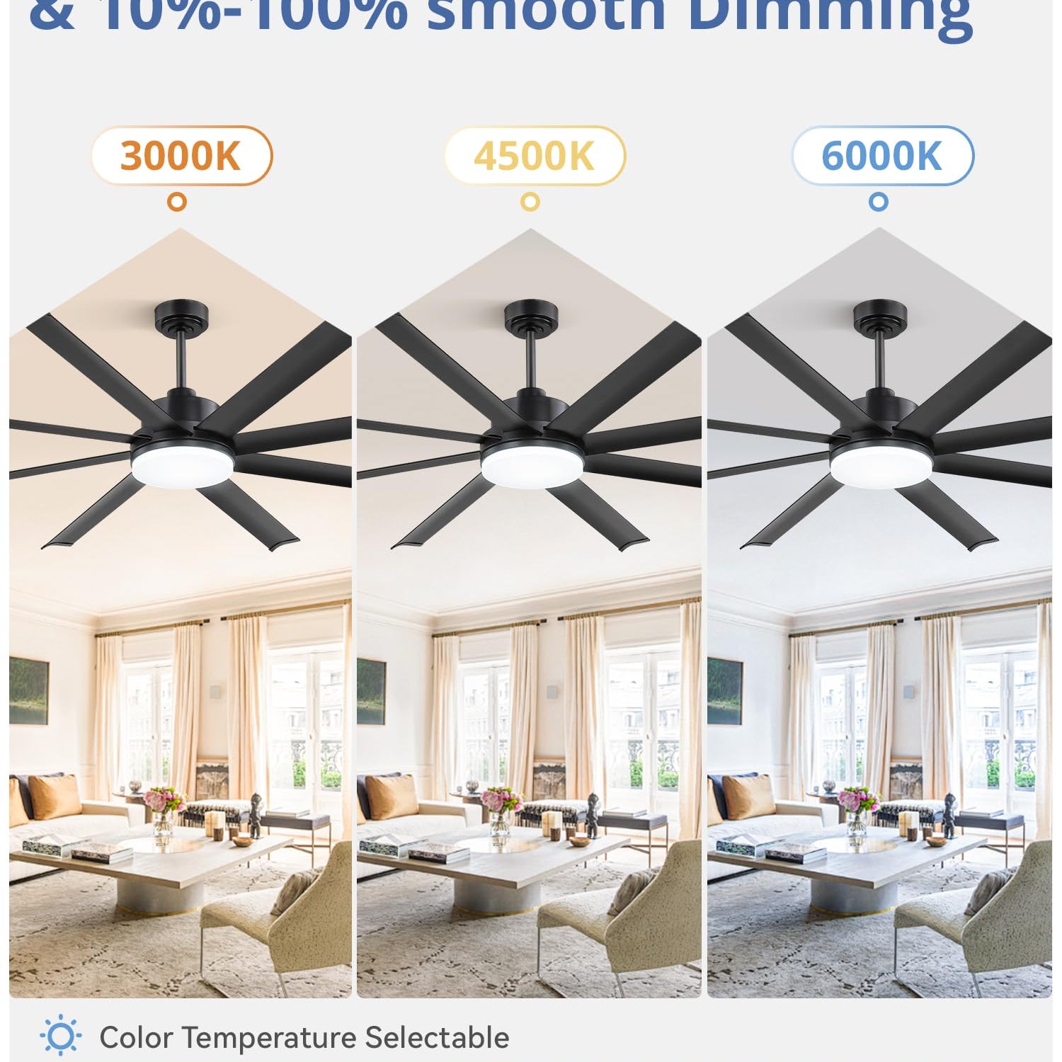 - Stepless Dimming: This large ceiling fans with lights has 3 color temperature from warm (3000K) to white light (6000K), brightness from 10%-100% with 1800LM. Suitable for living room, bedroom, garage, shop or outdoor ceiling fans for patios