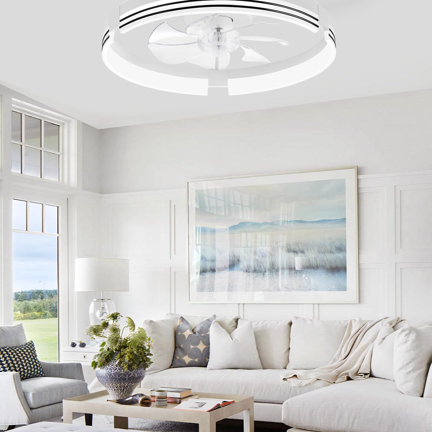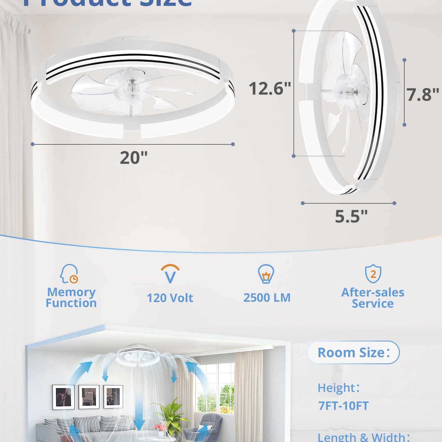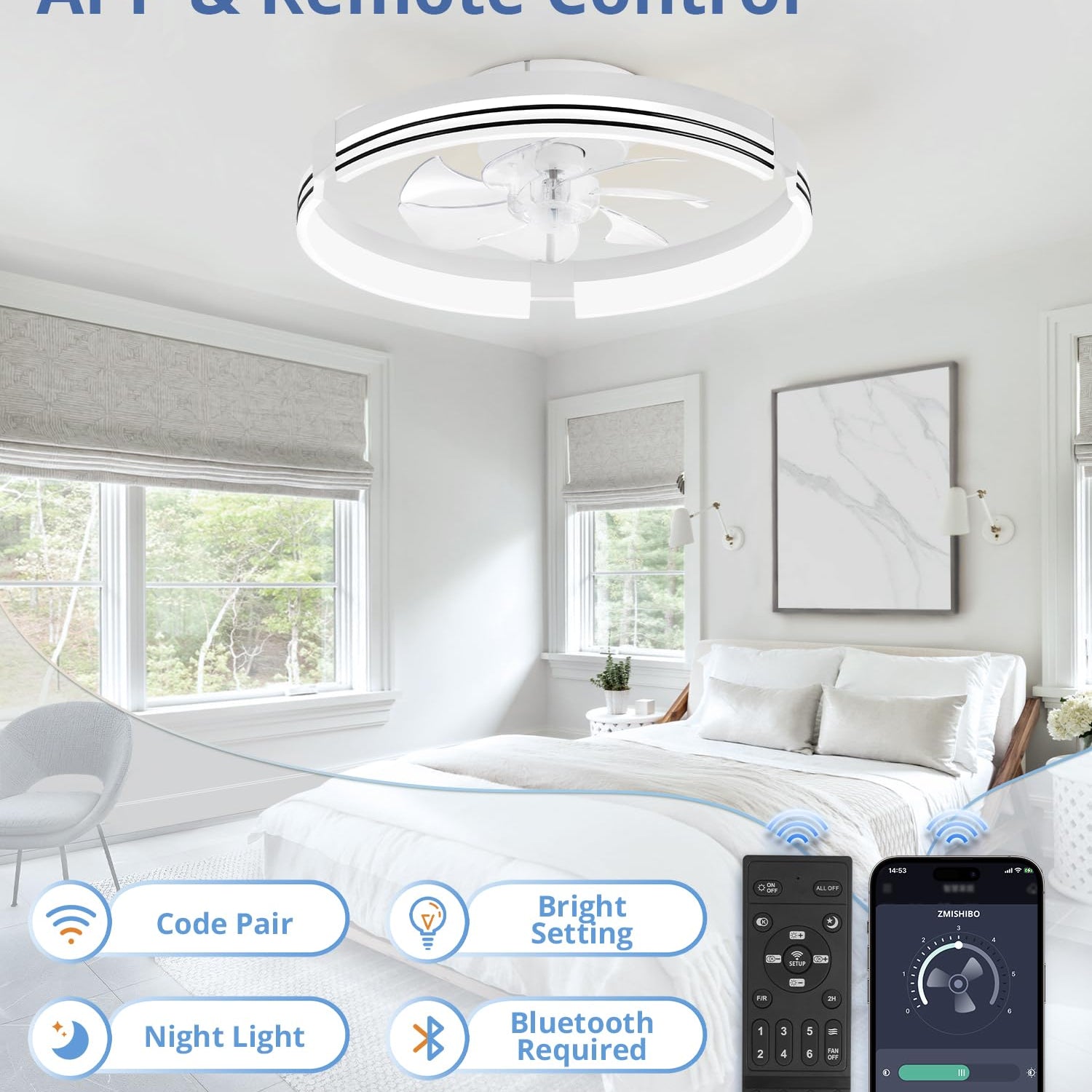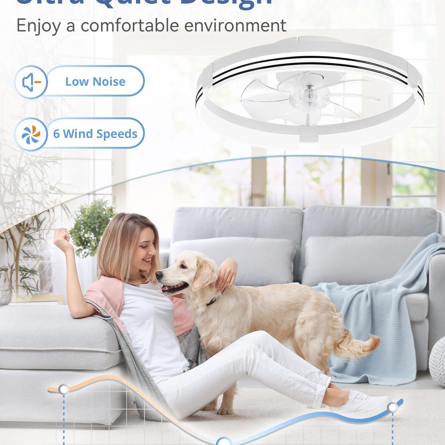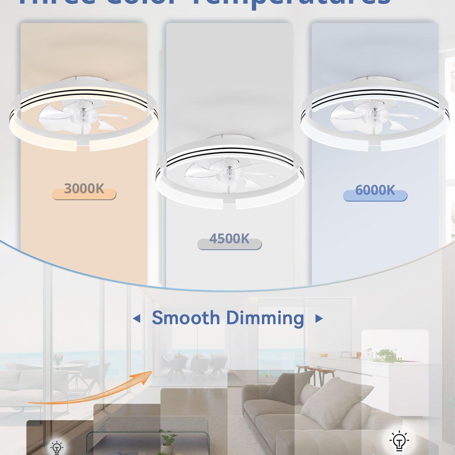 ZMISHIBO Low Profile Ceiling Fans with Lights and Remote, 20 Inch Flush Mount Ceiling Fan with Light, 3000K-6000K Dimmable Fandelier LED Fan Light, 6 Wind Speeds White Ceiling Fans for Bedroom