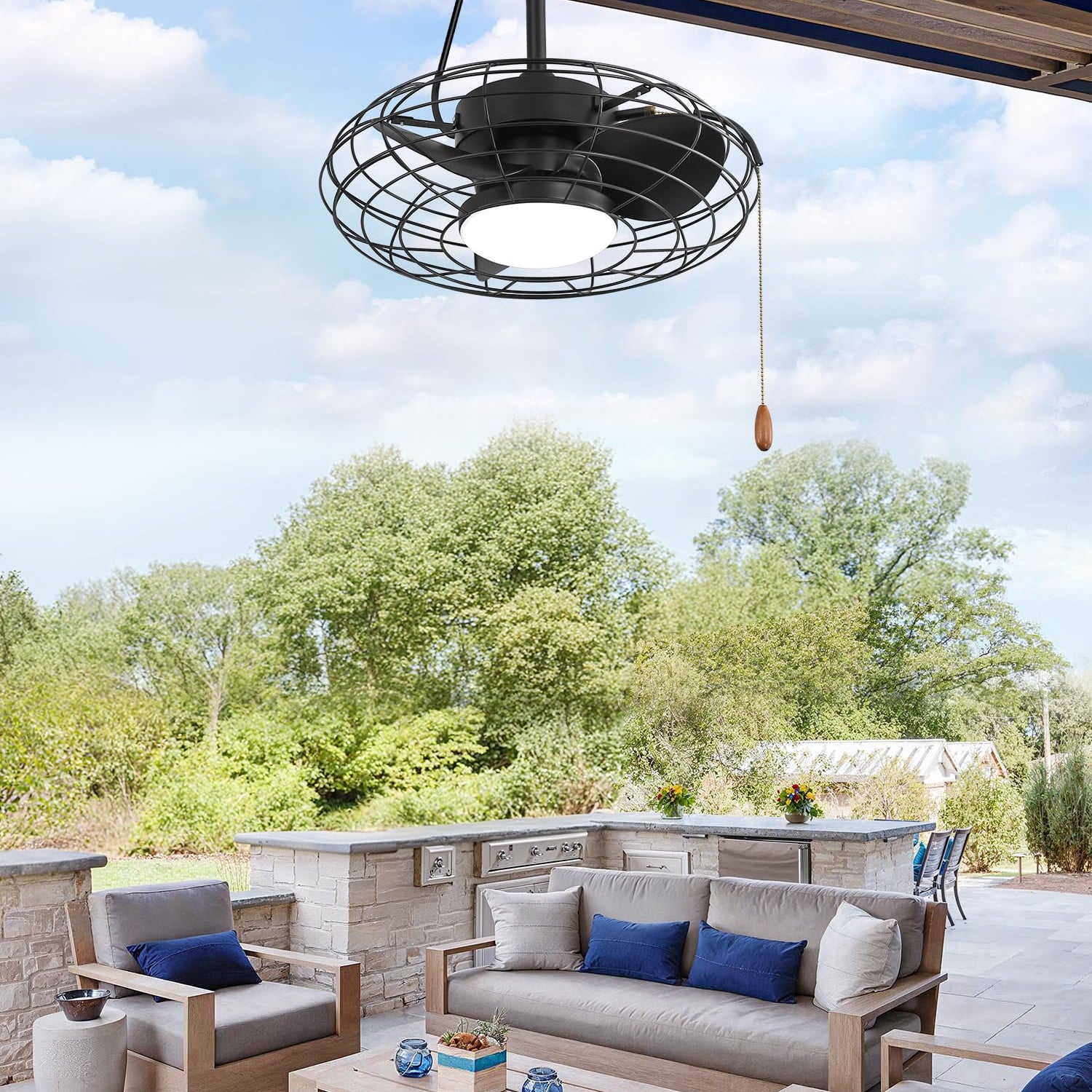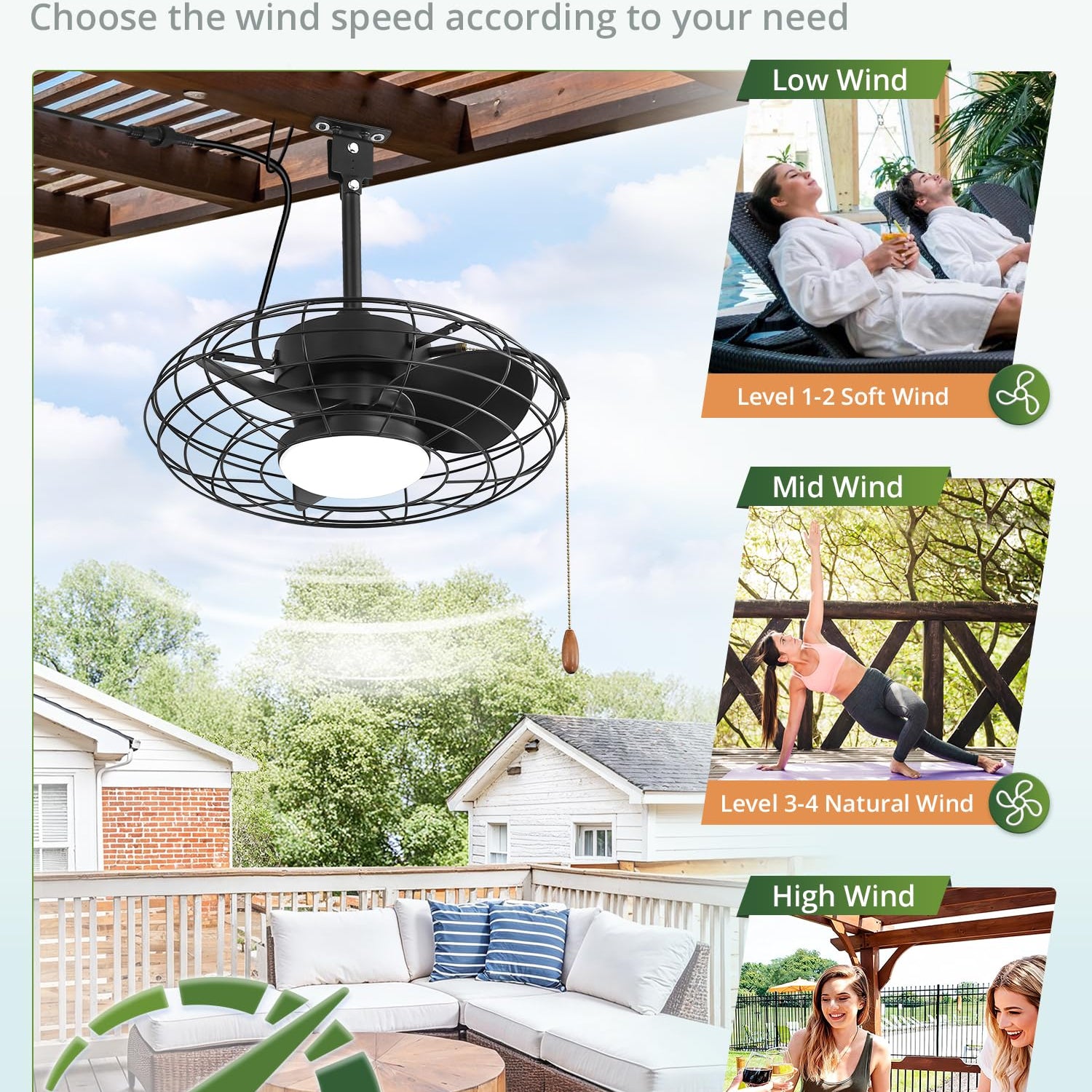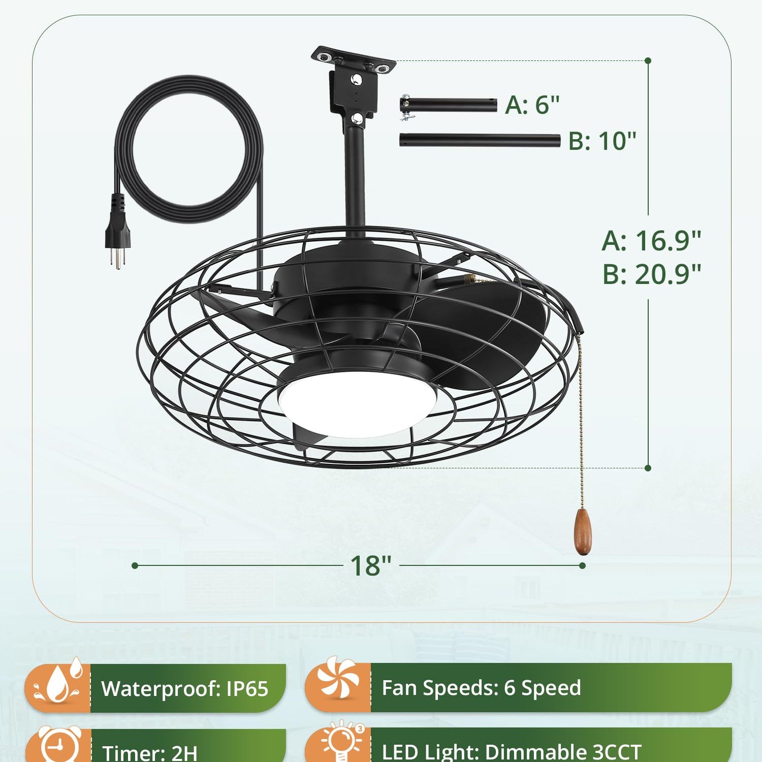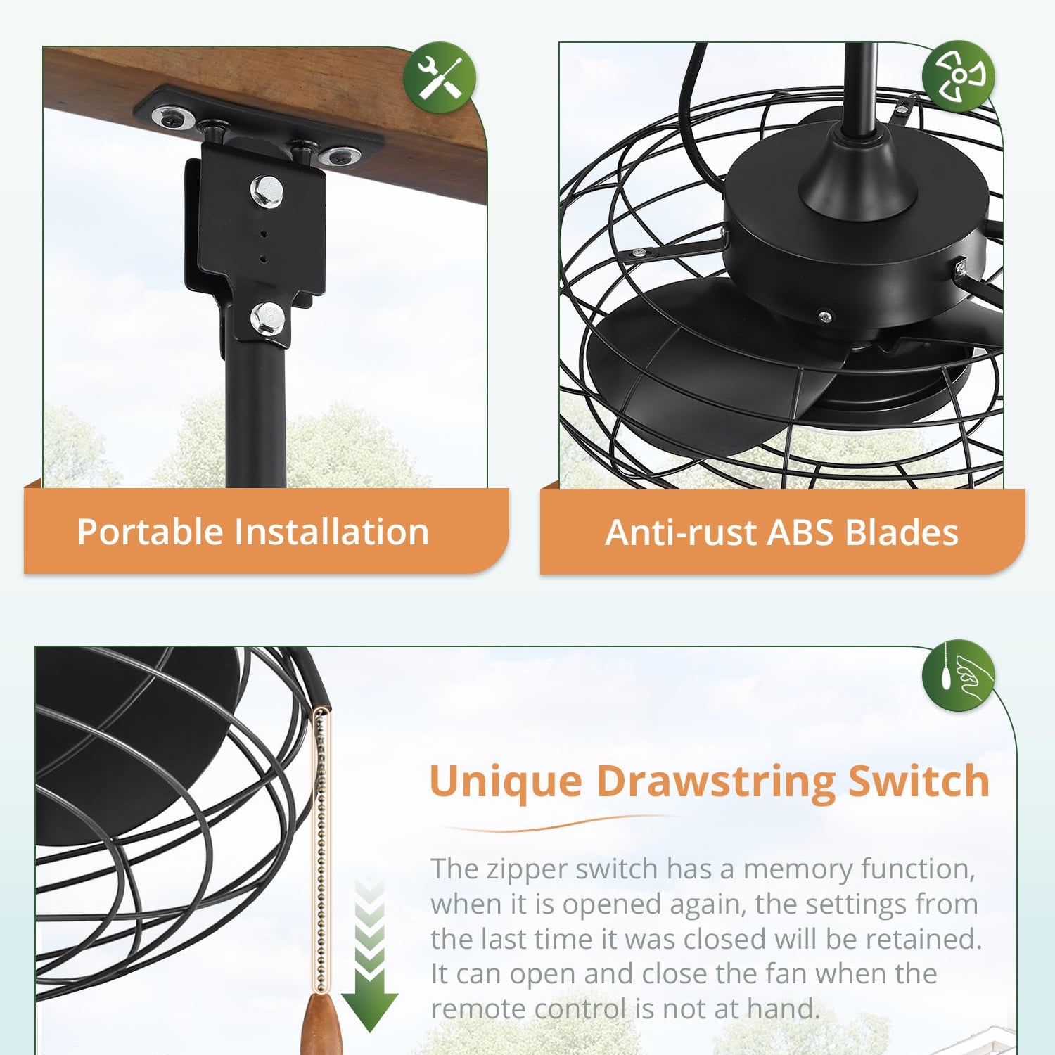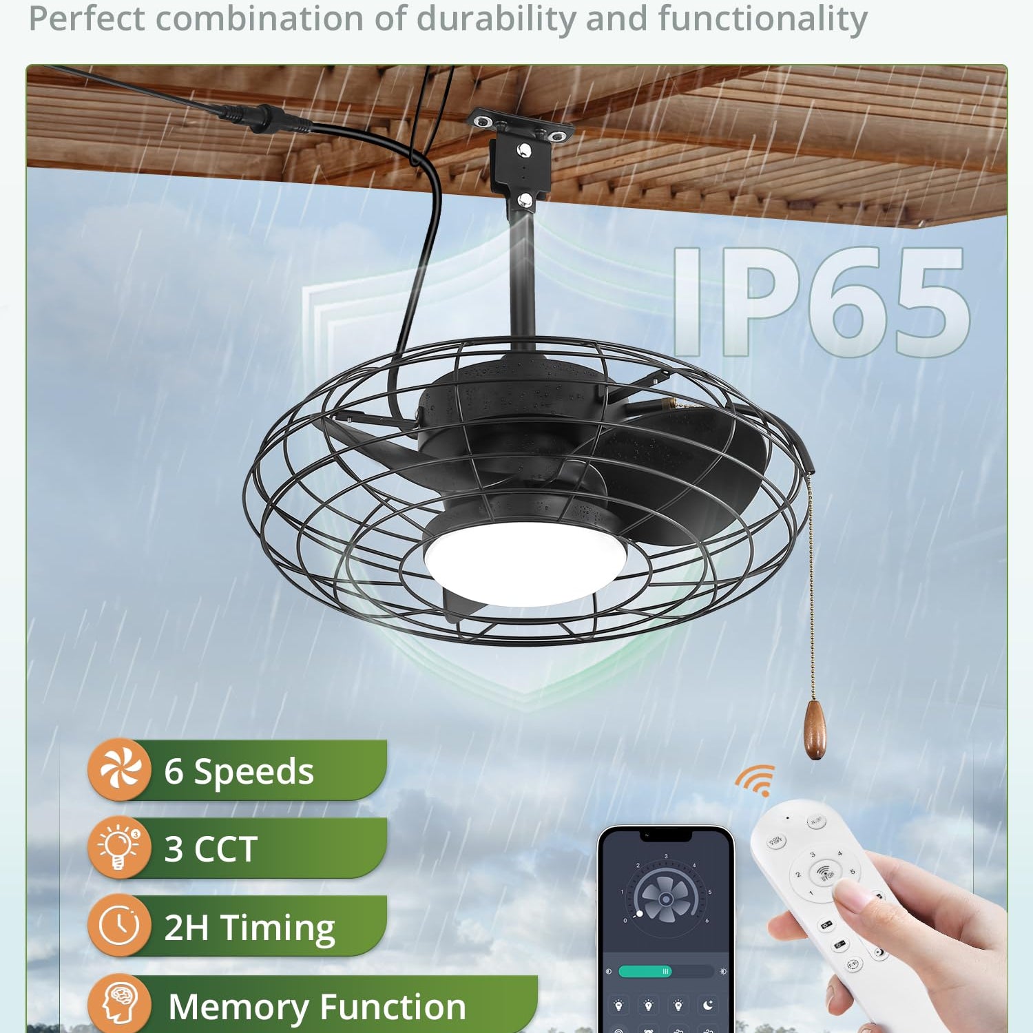 ZMISHIBO Outdoor Ceiling Fans with Light for Patios,Waterproof Gazebo Fan with Remote Control Smart App,3CCT Dimmable,Plug in Caged Ceiling Fan with Pull Chain for Porch Pergola,Black