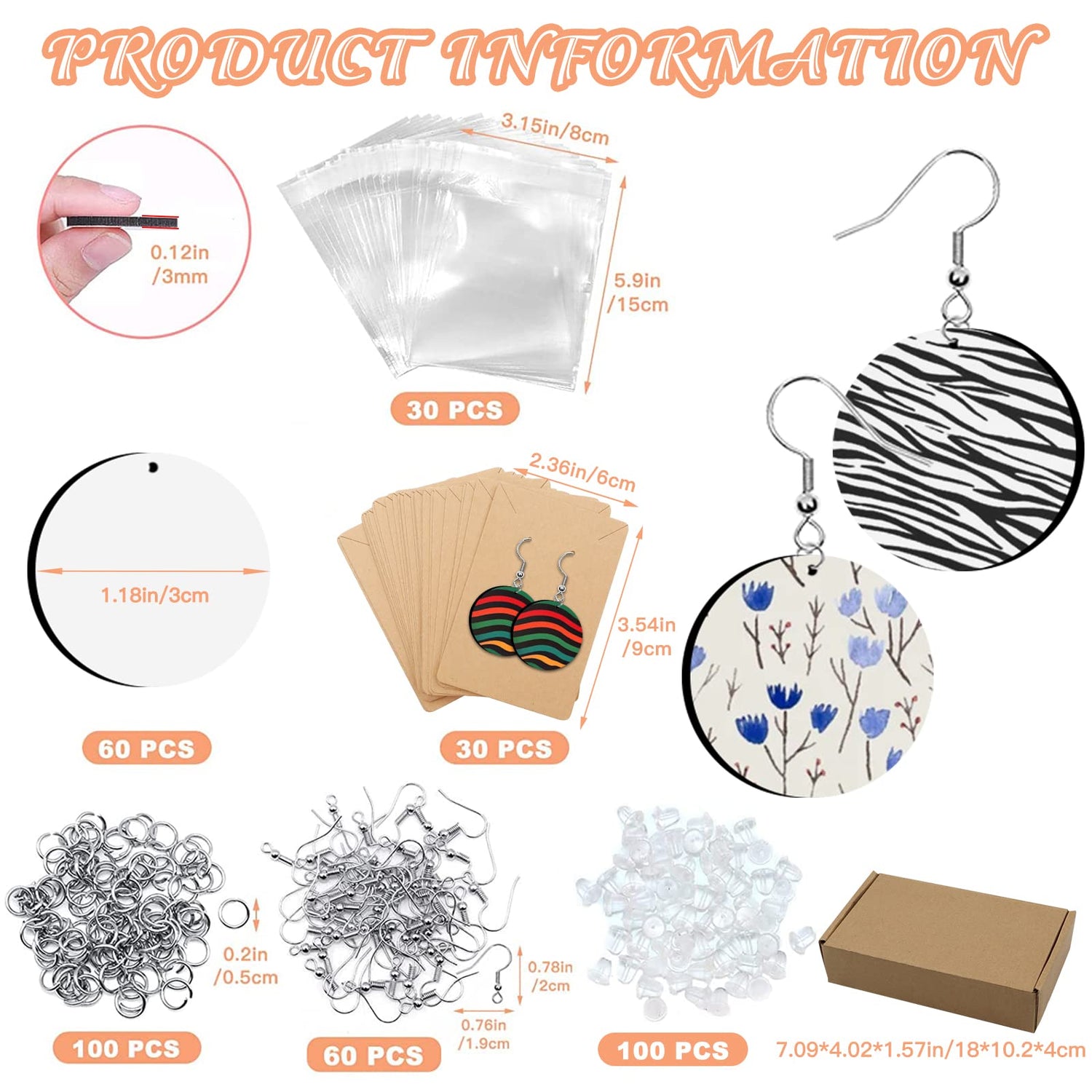 - WHAT YOU WILL GET: The sublimation earring set contains a total of 380 Pcs, includes 60 pcs round sublimation blanks earring, 60 pcs earring hooks, 100 pcs jump rings, 100 pcs Earring Backs, 30 pcs earring packaging cardboard, and 30 pcs earring bags. enough sublimation accessories to meet your different jewelry making needs. You can make personalized jewelry making, ornament making, earrings making and other DIY handmade craft projects with these sublimated blank earrings