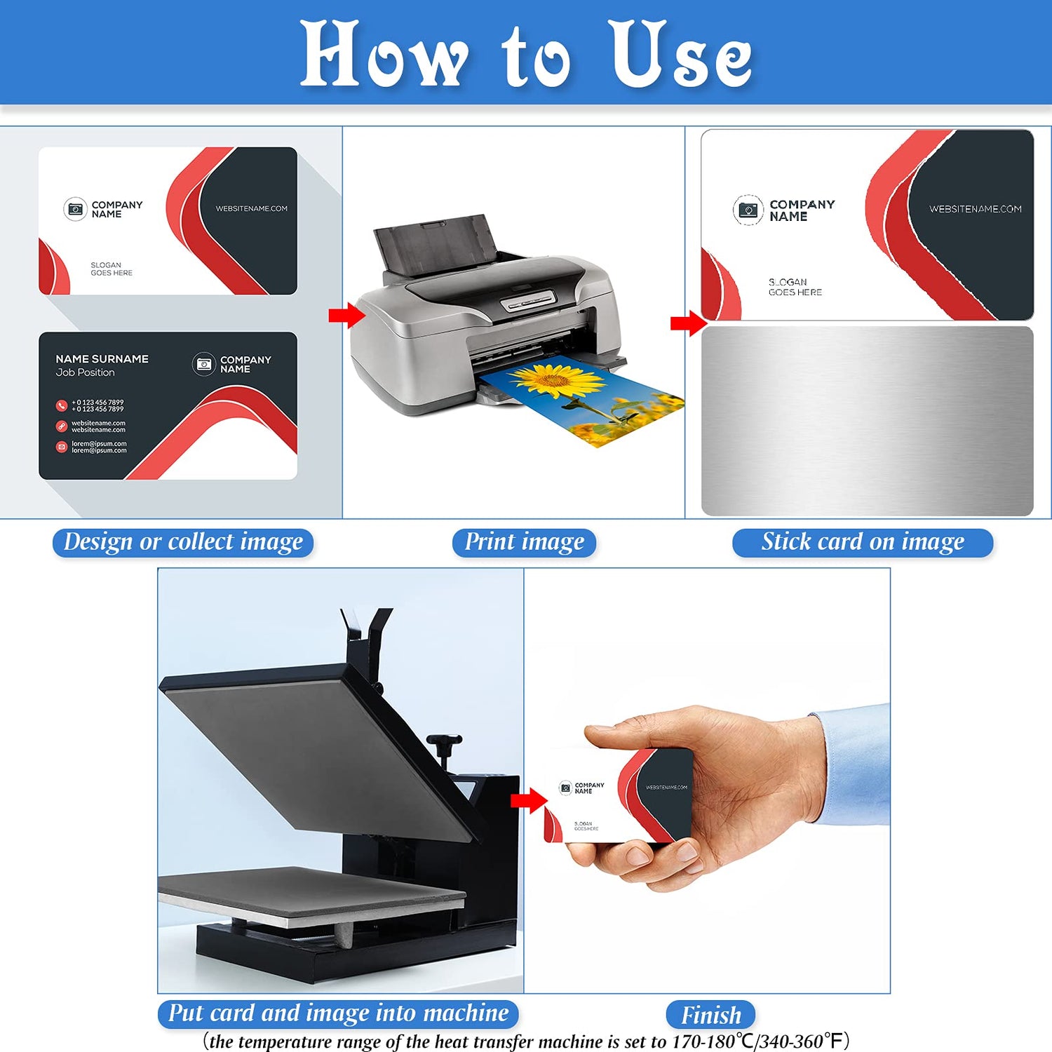 Print out the images that you have designed or collected, stick them on the sublimation metal business cards, and then put them all into the heat transfer machine; The temperature range of the transfer machine is set from 170 to 180 degrees centigrade (340-360 degrees Fahrenheit), and finally you will get the complete products after the heat transferring process.