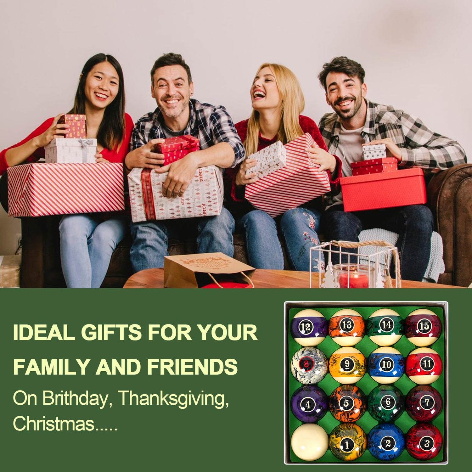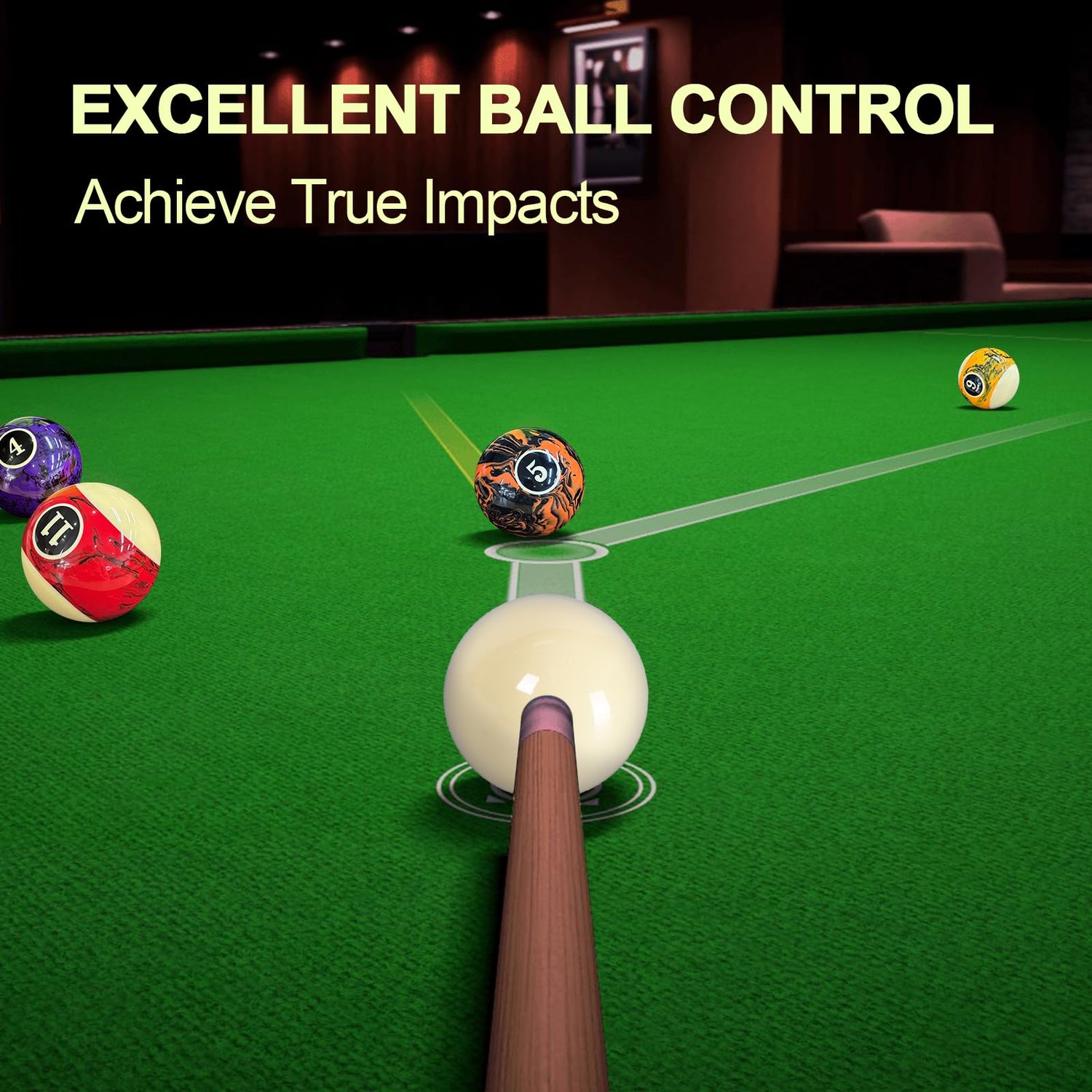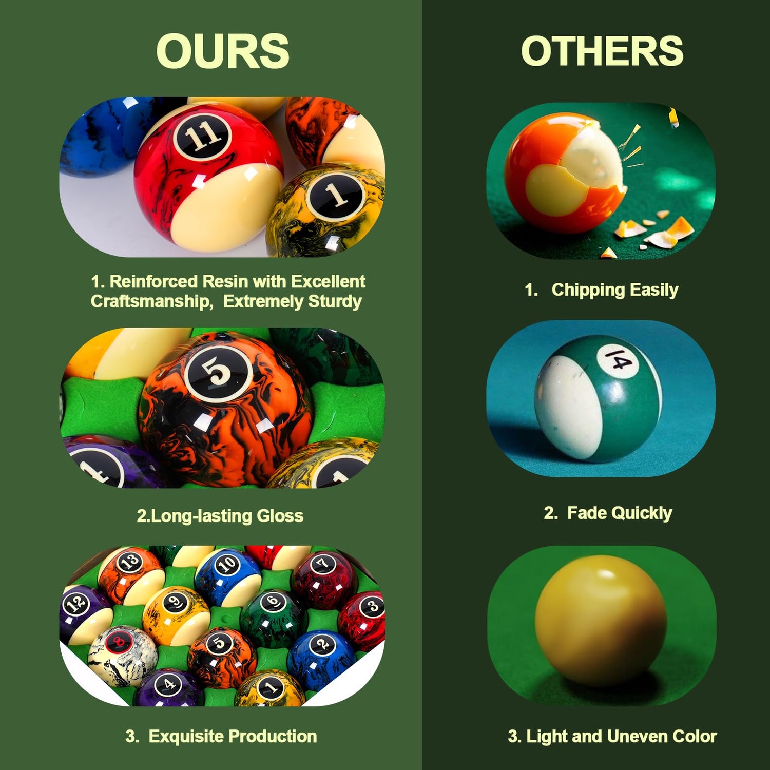 - POOL TABLE BALLS:The billiard balls are made of high quality polyester resin marble pool balls and meet all professional quality standards for size roundness density, balance weight and hardness the sound of the ball hitting the ball will inspire your game