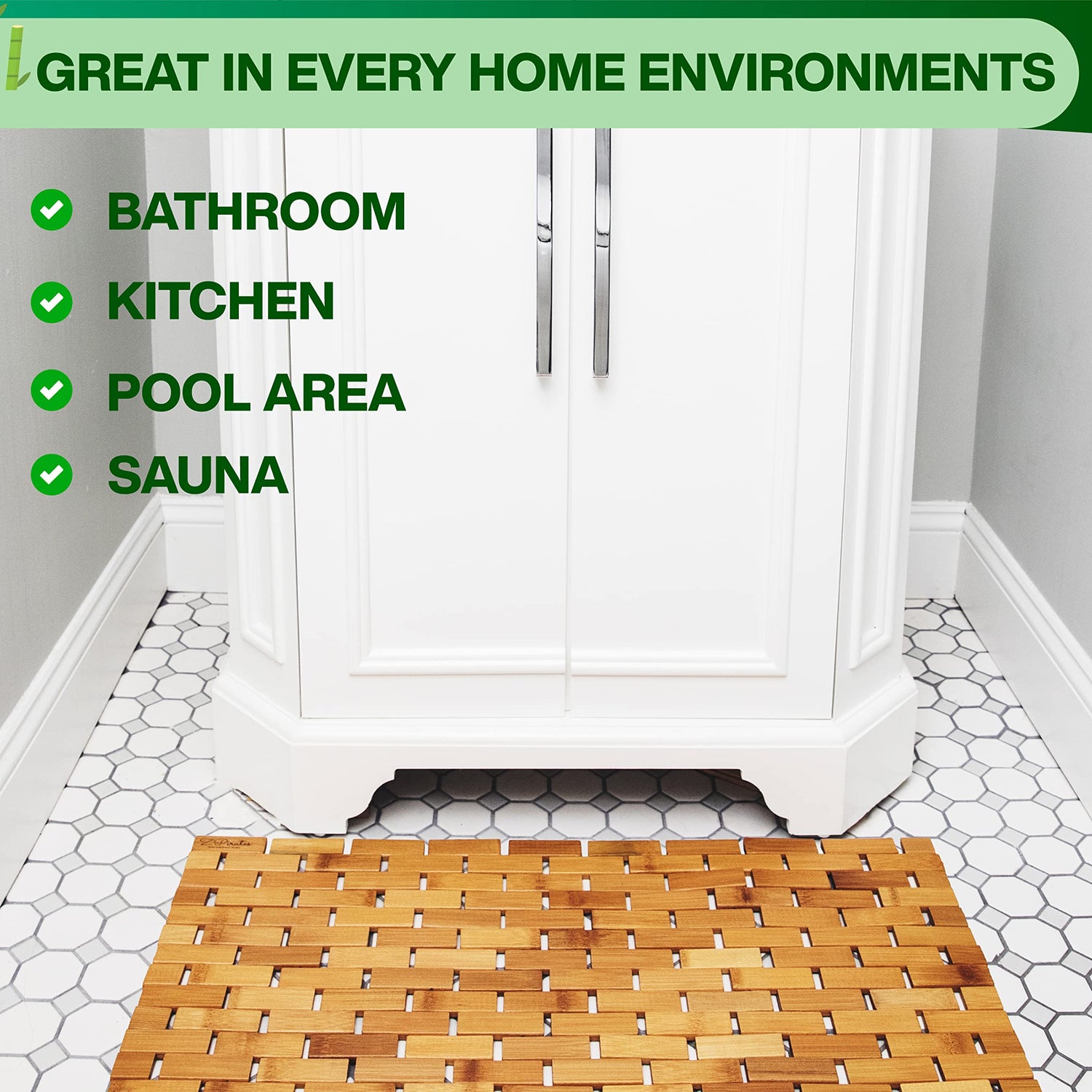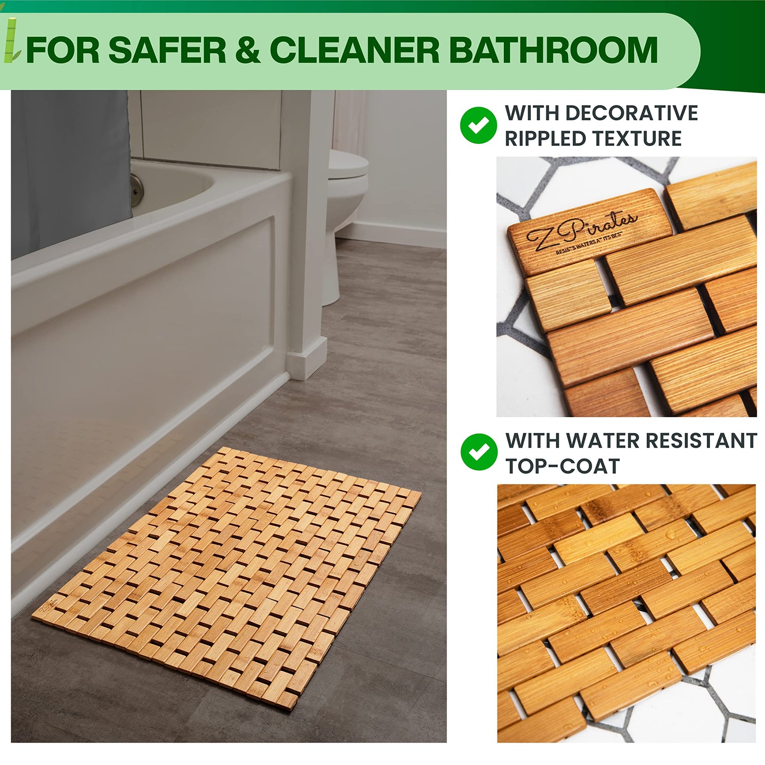 Details: Get your beautiful natural bamboo bathroom mat today. Waterproof, Easy to clean, Non slip, Durable, user-friendly. NON SLIP. This bamboo wood bath mat from ZPirates seamlessly blends fashion and function. Not only is its modern, minimalist look incredibly stylish, it offers you safe, solid footing on wet or slick surfaces where you can easily slip and fall. Soft anti-skid rubber pads are positioned underneath to protect your floors and stop the mat from sliding. INDOOR / OUTDOOR. Bamboo floor mats are easier to clean and maintain than bathroom and kitchen rugs and give any room an instant style upgrade. Swap one out with your dirty old door mat, and place them around your sauna, pool area, backyard, deck, garage, RV or boat for safe, secure footing even when faced with high temperatures and damp conditions. Each multipurpose mat can be rolled or folded for fast, easy storage. HOME FRIENDLY BAMBOO. At ZPirates, we use premium seasoned bamboo wood with industrial monofilament fibers for maximum strength. Weighing just 2 pounds, our bamboo mats are lighter than teak wood and rubber mats and much more durable. They would not stain, sag or bend for long-lasting use indoors or out. DURABLE, WATERPROOF FINISH. The seasoned bamboo undergoes a high-temperature process to remove water and sugar, making the mat and resistant to water. It is also coated to prevent scratching and staining to preserve the pristine finish. The lattice design lets water flow through to prevent it from pooling on top and also allows air to circulate to better preserve the wood. EASY TO CLEAN. Measuring 34 x 18 x 0.3 inches, our bamboo wood mats are bigger than most bath mats. To clean, spray with water or wipe with a damp cloth. The ZPirates team takes pride in the quality of our products. If you are not satisfied with your mat, please let us know and we will immediately send a new one at no charge. Get your beautiful black bamboo mat today.