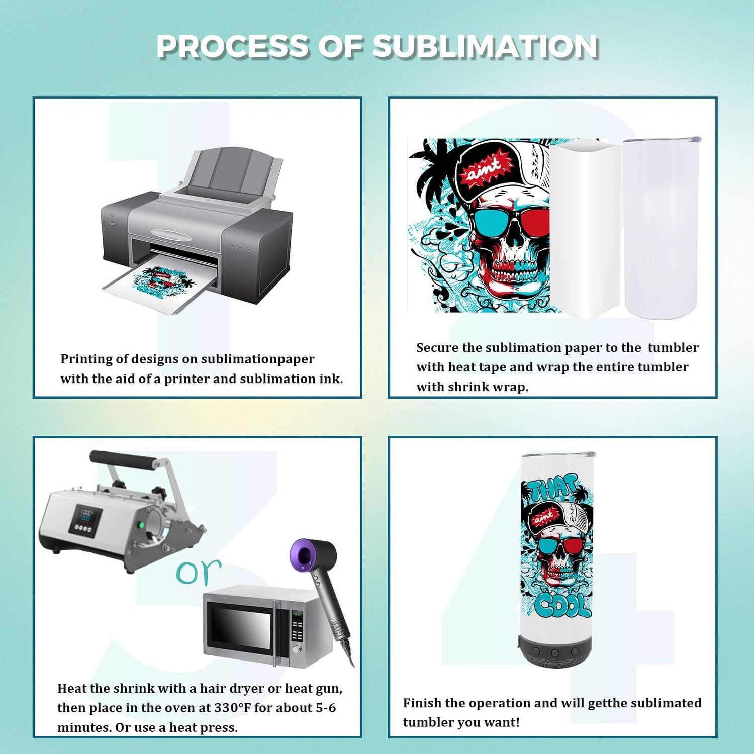 3). Full wrap film with heat shrinkable film, 380℉, tumbler press for 100-150s; Oven for 10-15 mins, get a well-printed glass cup;