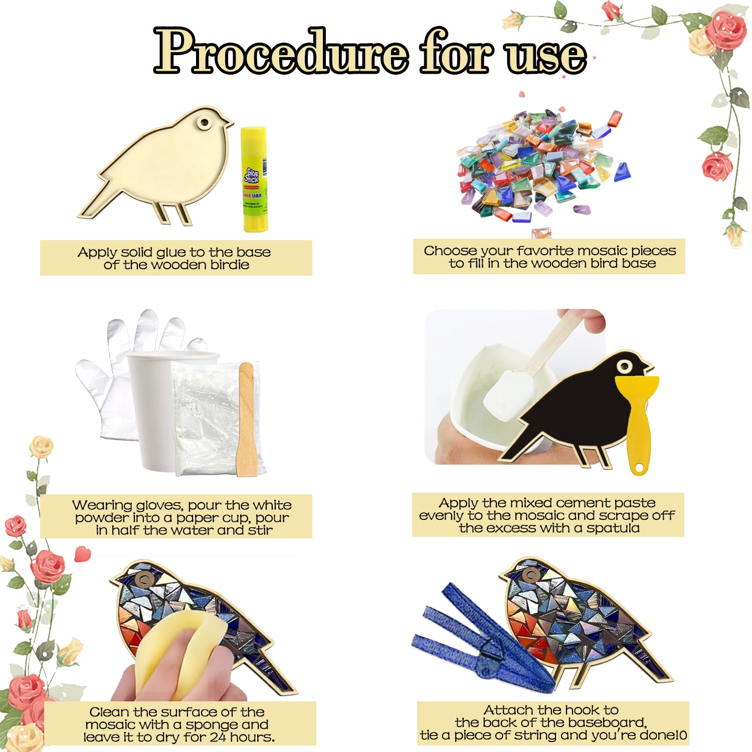 - 🦜 MOSAIC DIY KIT: Our mosaic puzzle materials include wooden mosaic tile filler backing, paintbrushes, grouting powder, different coloured diy mosaic tile pieces, sponges, spatulas, and other craft accessories.