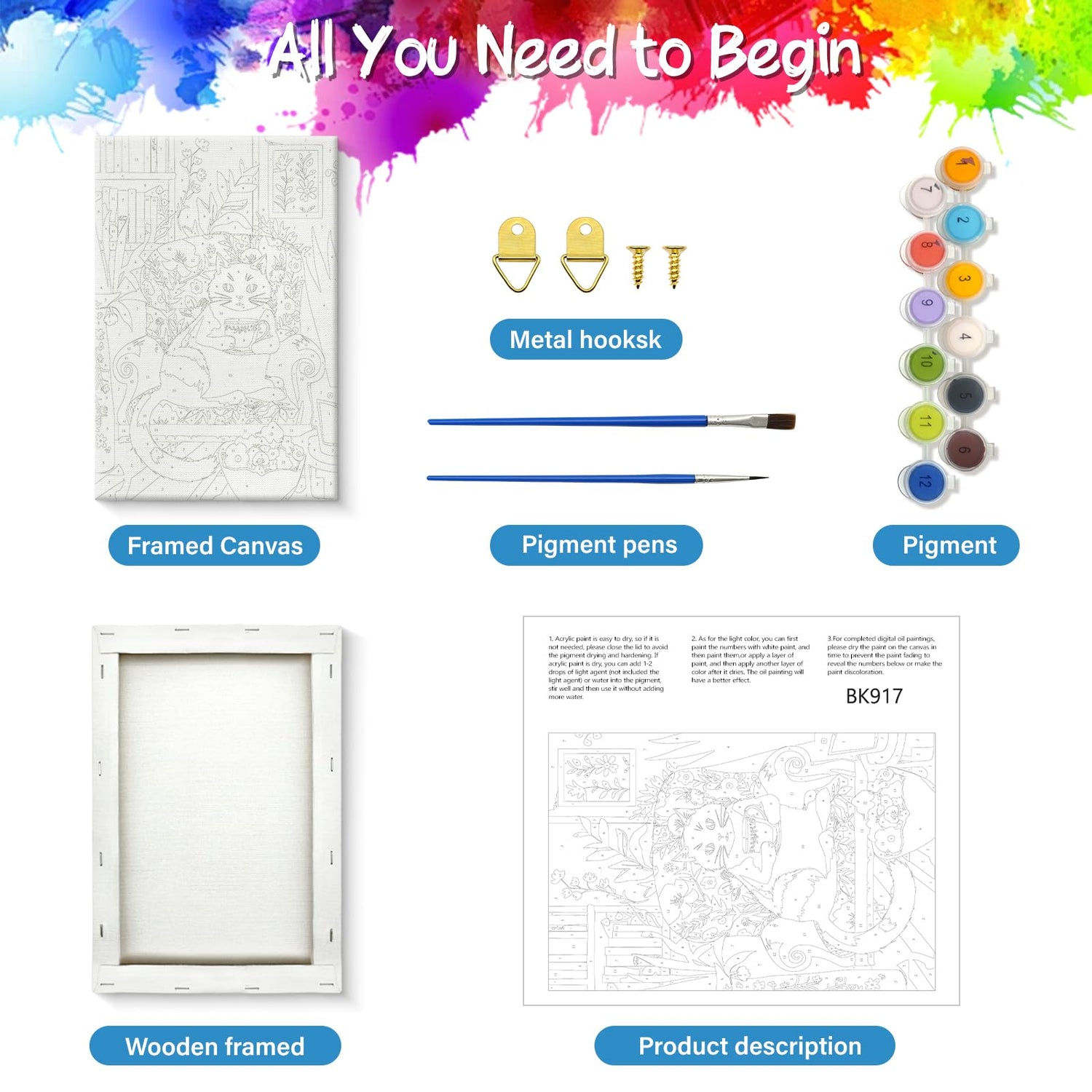 - What Will You Get: You will receive a black cat paint by number framed kit includes HD pre-printed canvas x 1, a colorful box ,different size brushes x 2, ample acrylic paint set x 1, hook x 2, a copy of number paper for reference