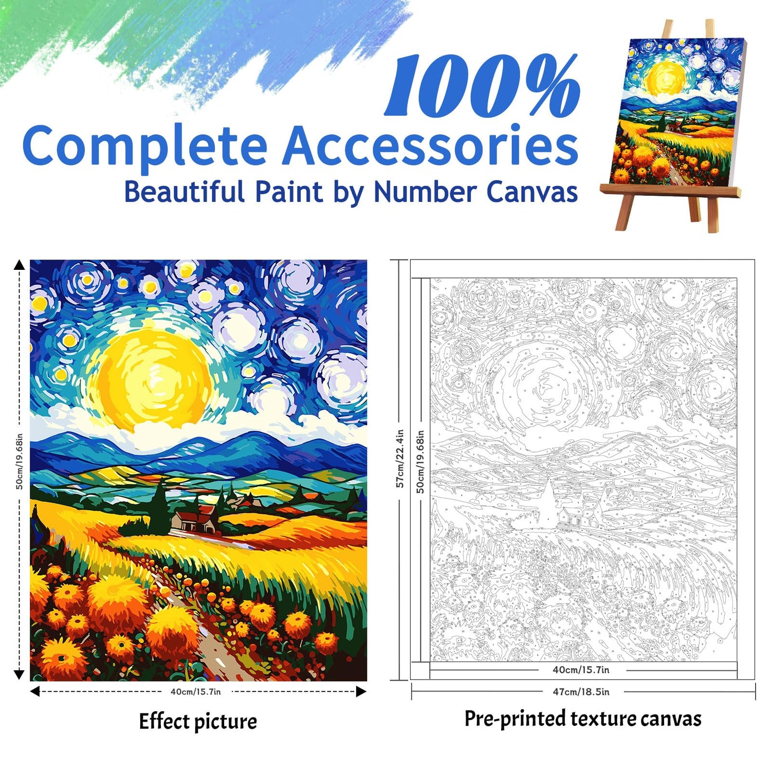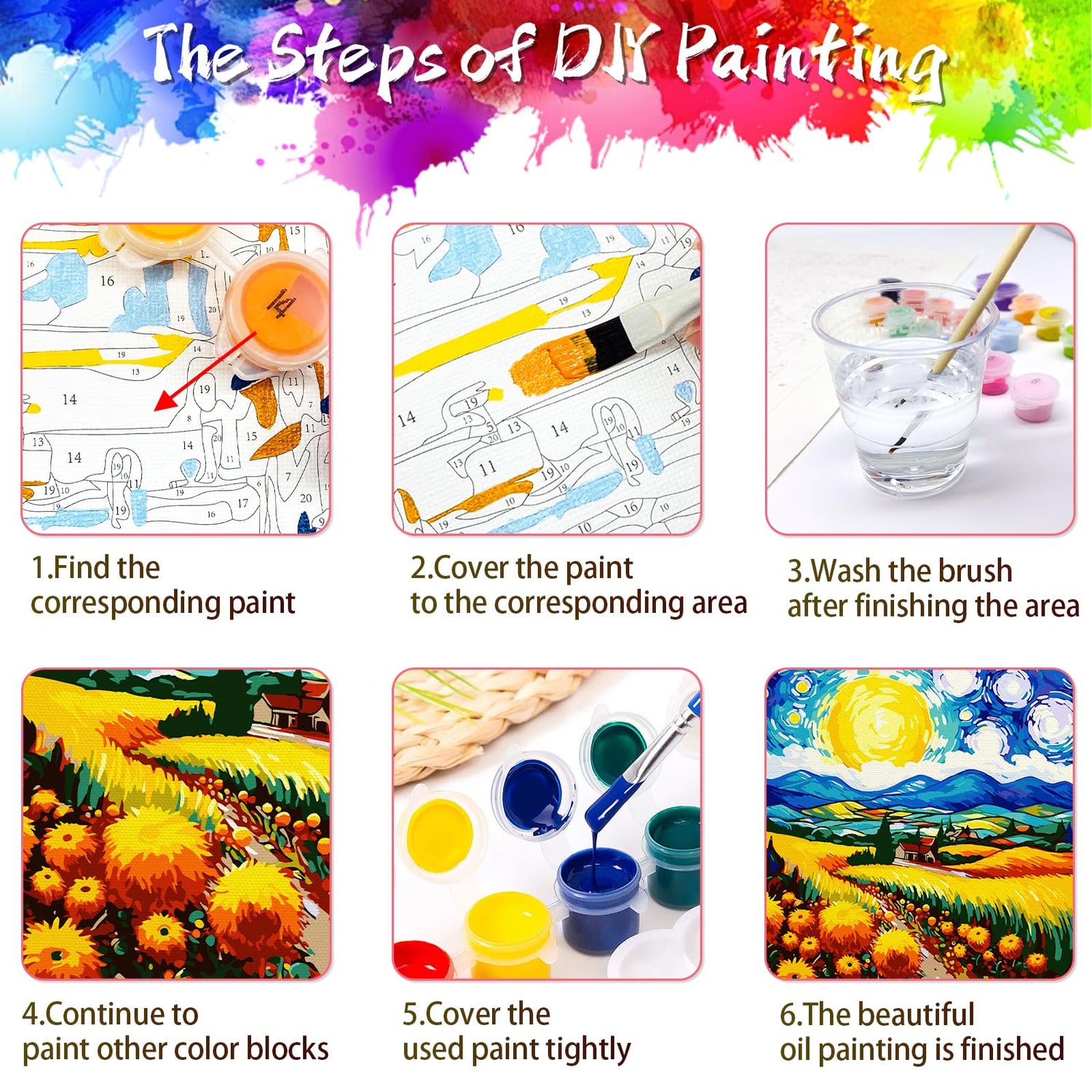 - Sunflower Field Paint by Number: 1 pre-printed textured canvas (unframed), 1 set of acrylic paints, 1 set of brushes (3pcs), 2 hooks. A reference picture,1 postcard-sized guide