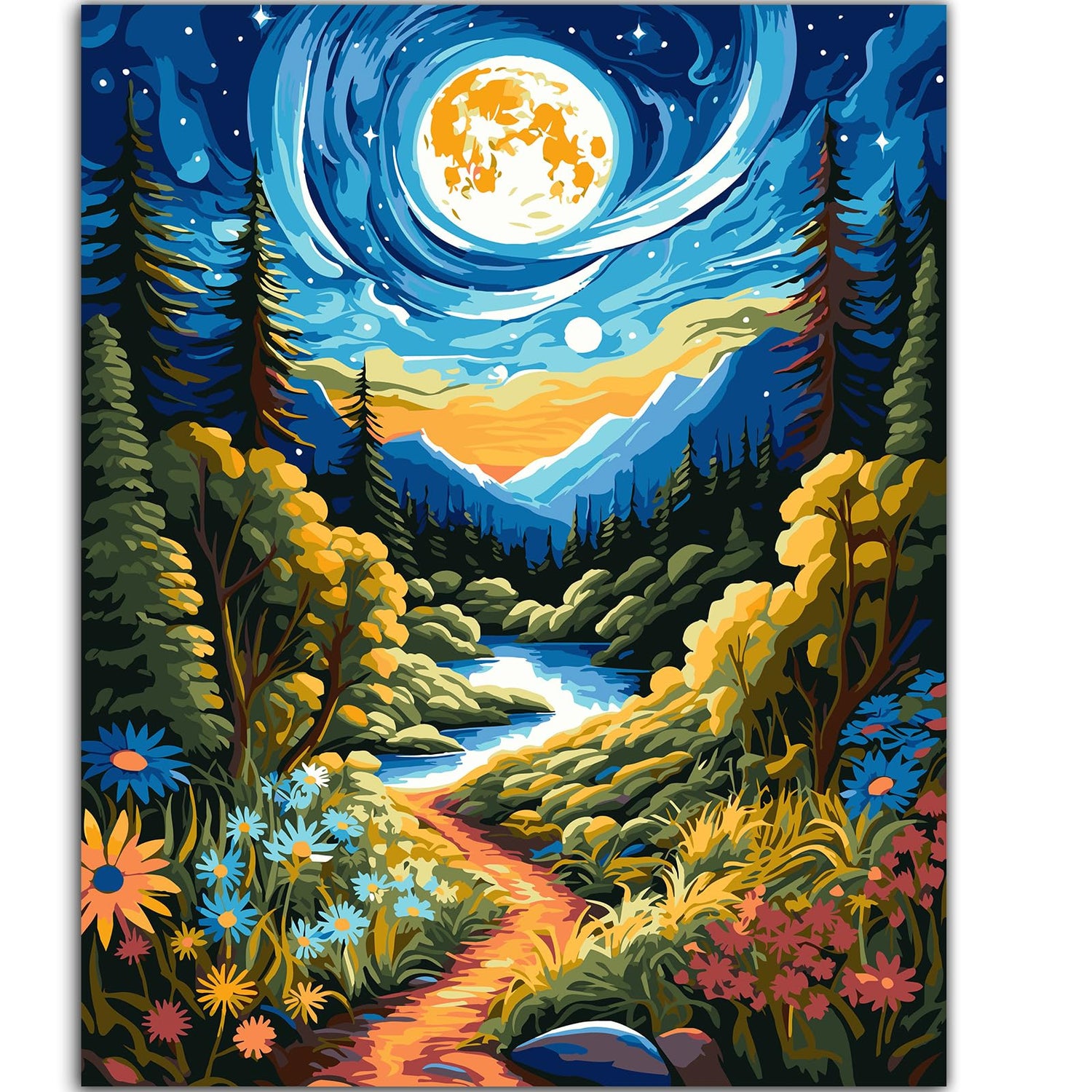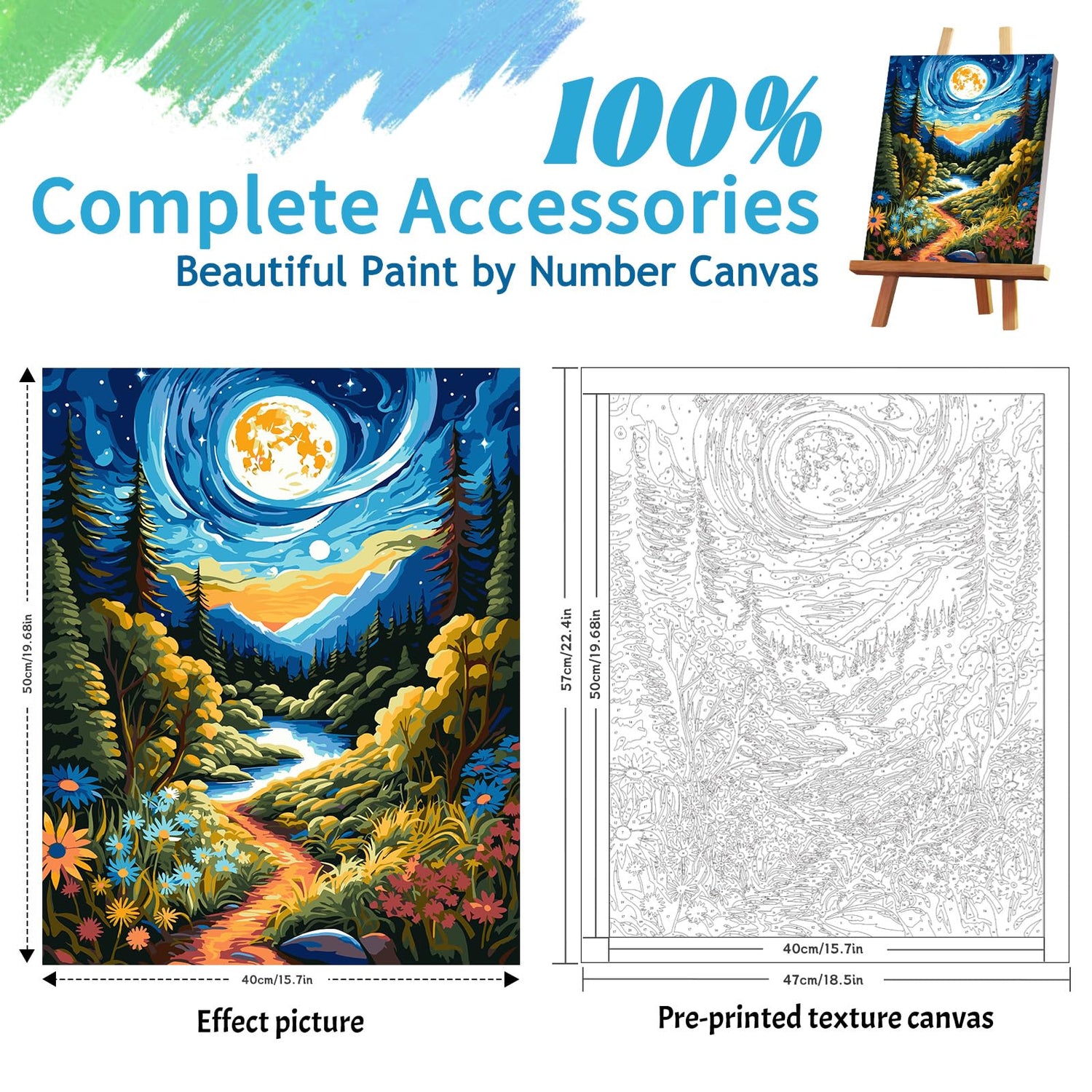 - Beautiful Decorations of Wall: The DIY landscape adult paint by number kits on canvas forest moon scene is very suitable for placing in the room, dinning room, wall, table, study, office and so on, the perfect interior decoration will make your room more romantic and cozy