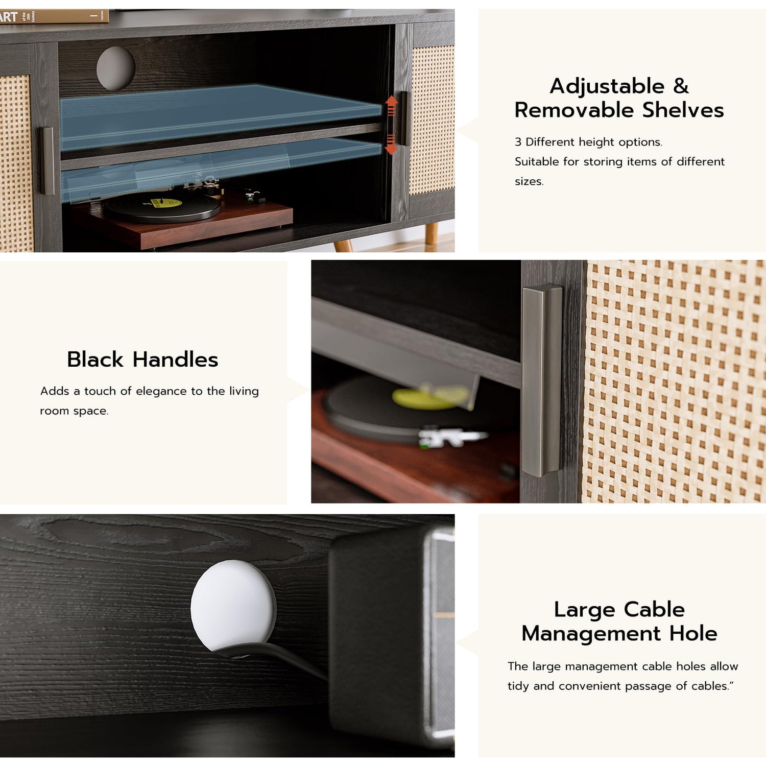 - CONVENIENT STORAGE: Middle shelf and 2 large cabinets storage your favorites. And more, 2 cord holes behind arrange your wires well. Display or Hide? This mid-century tv stand is good at that