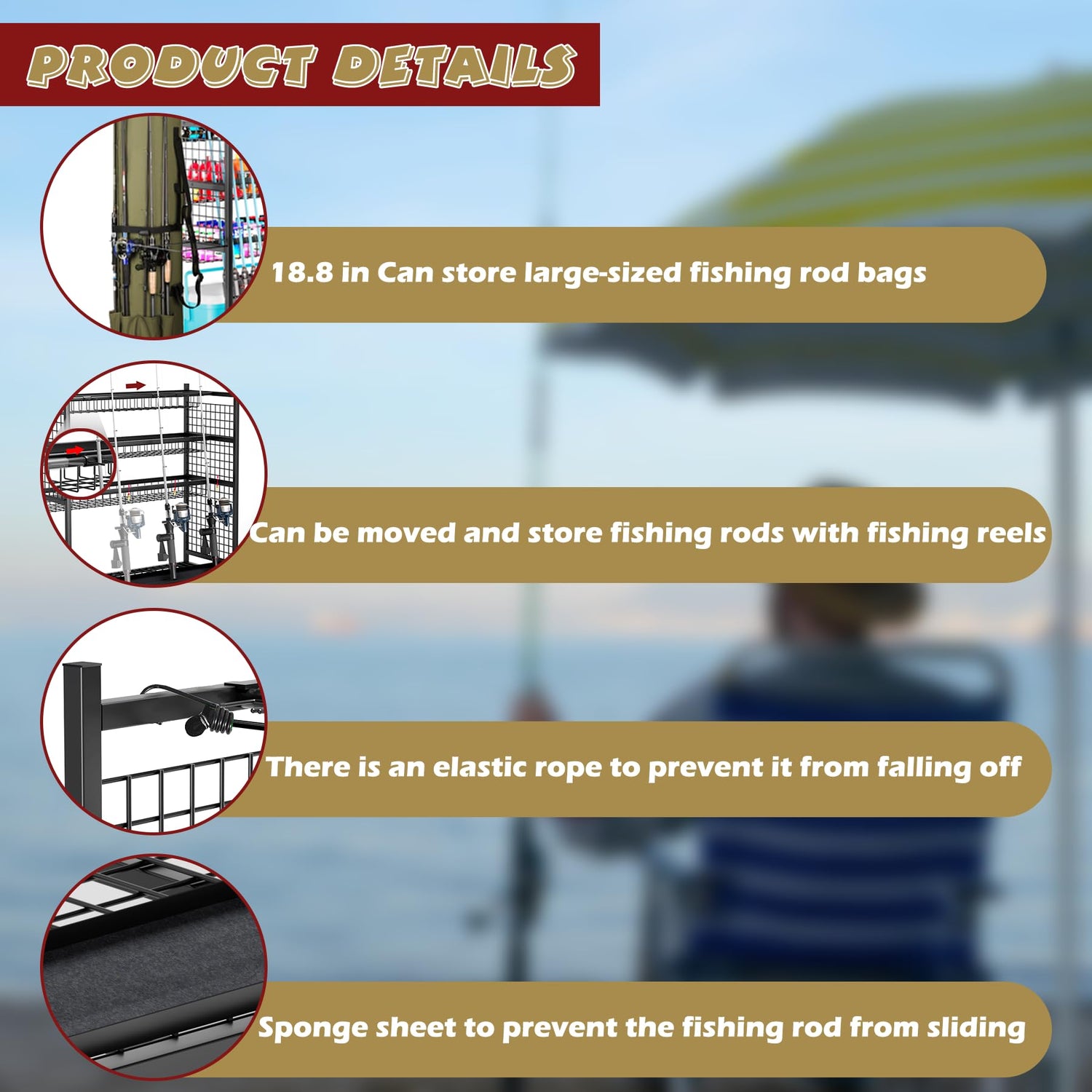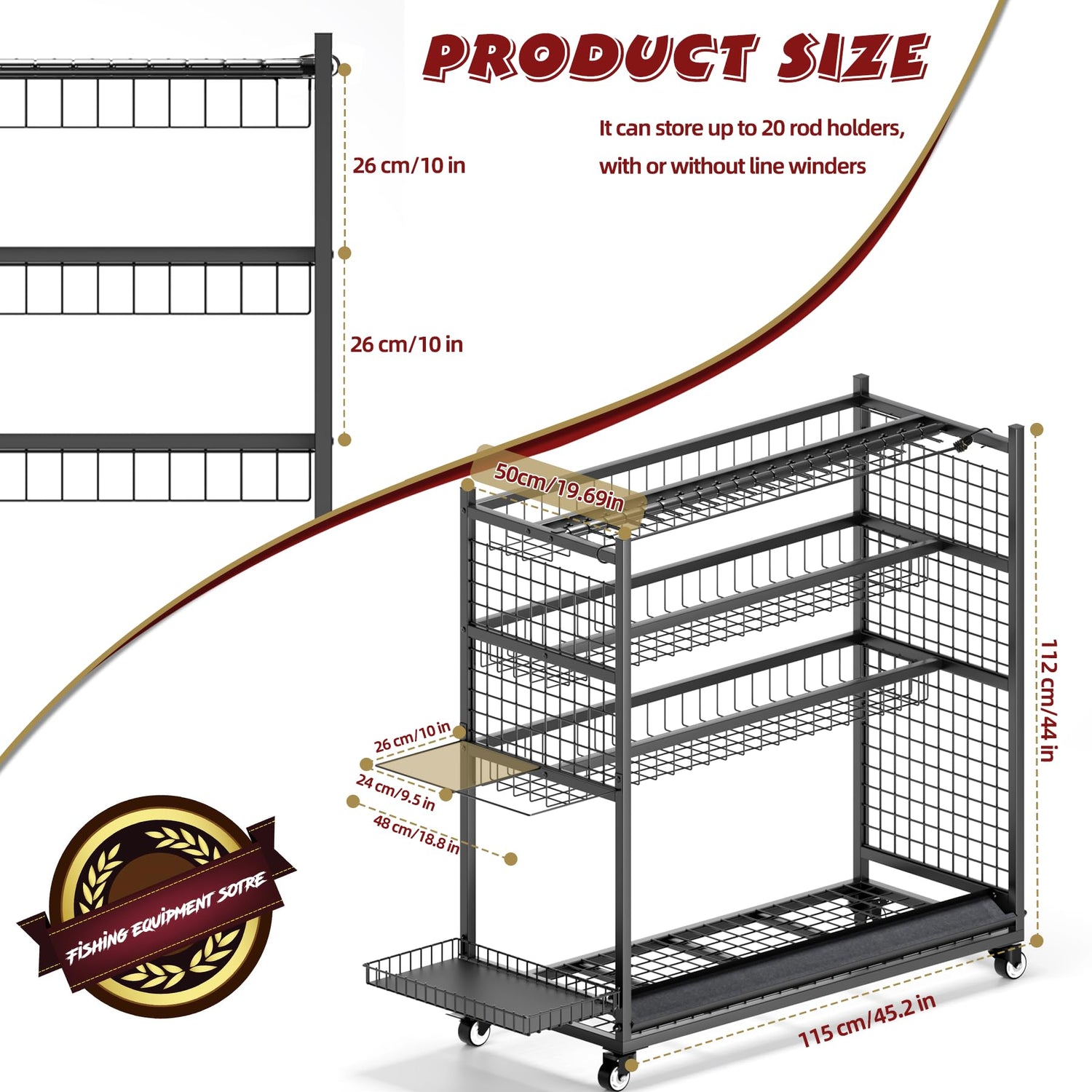 - Oversize: 45.2in extra large capacity 4-tier fishing rod holder can hold 20 rods with winders as well as fishing related supplies: tackle box, lures, fishing reels and other essentials, a great Christmas or Father's Day fishing gift for men