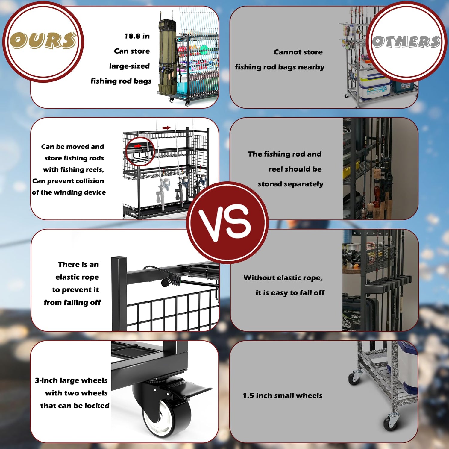 - Easy Movement- Equipped with four 360° swivel 3-inch casters to adapt to different ground requirements, two of which are equipped with brakes, allowing you to easily move and position the fishing gear rack anytime, anywhere