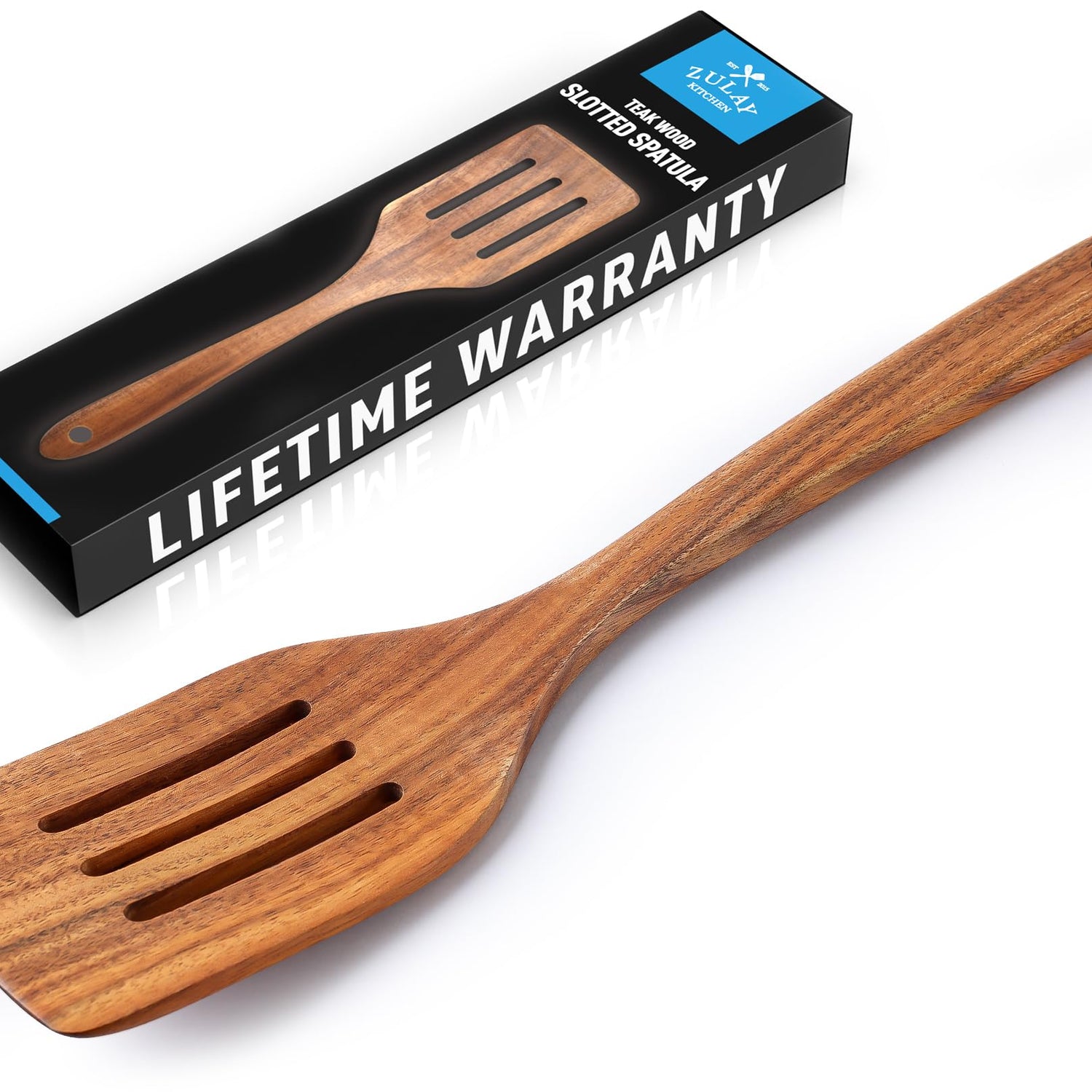 Zulay Kitchen Premium Slotted Spatula - Durable Teak Wooden Spatula For Cooking, Flat Wooden Spatula For Kitchen Use, Smooth Finish Natural Teak Spatula, Non-Stick Wooden Spatula