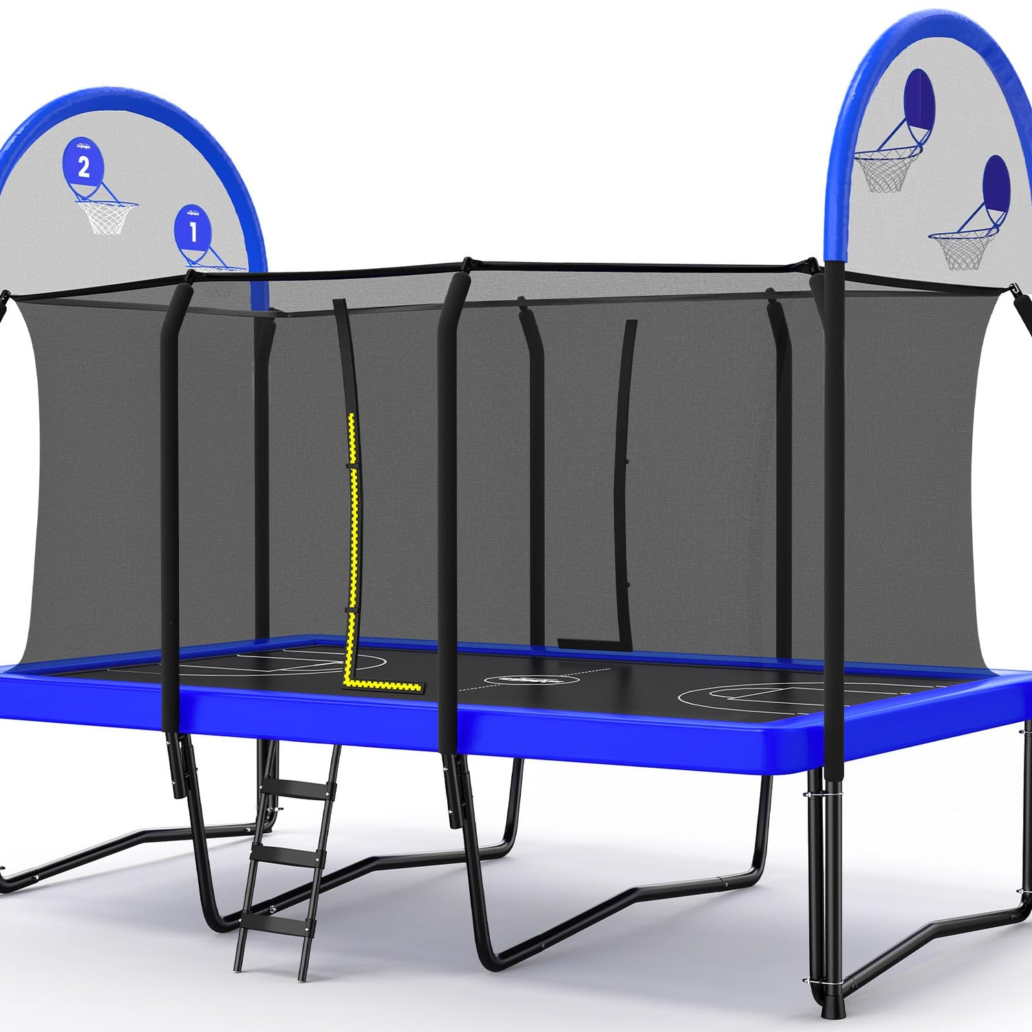 - 【2 Basketball Boards for All Ages】Zupapa's patented basketball hoops (Patent No. 2021218974899) cater to all ages, ensuring safe play with metal-free soft baskets and a surrounding net to keep balls contained. The design includes court-like lines, enhancing the authentic basketball experience on the trampoline.