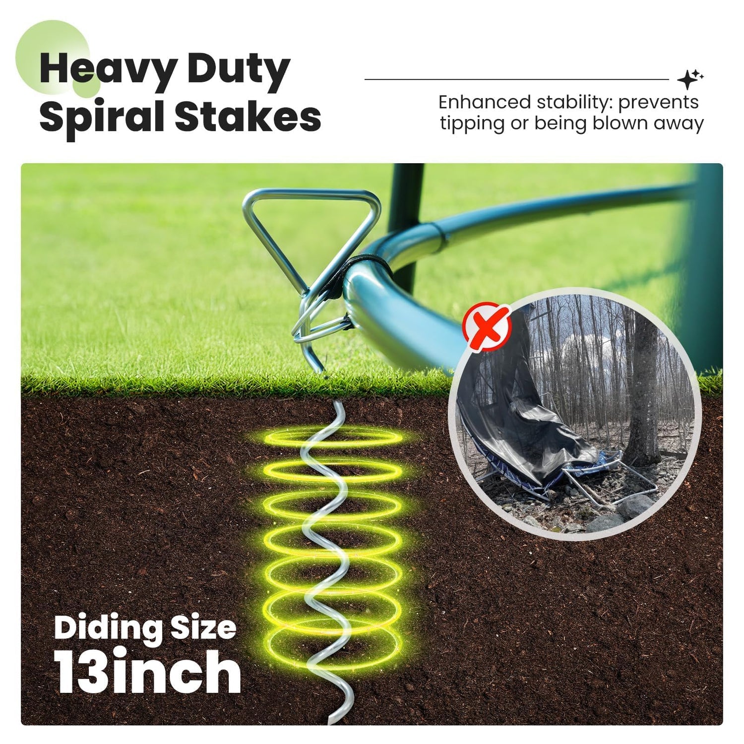 - 【Powerful Fixed Helper: Spiral Nail Stakes】Explore uninterrupted fun with our trampoline, designed to withstand the toughest winds. Outfitted with extra-long 13.4-inch spiral ground stakes, unlike the traditional short U-shaped pegs, our trampoline remains securely anchored. Enjoy peace of mind knowing it stays upright and damage-free, even in challenging weather. Perfect for compact outdoor spaces!