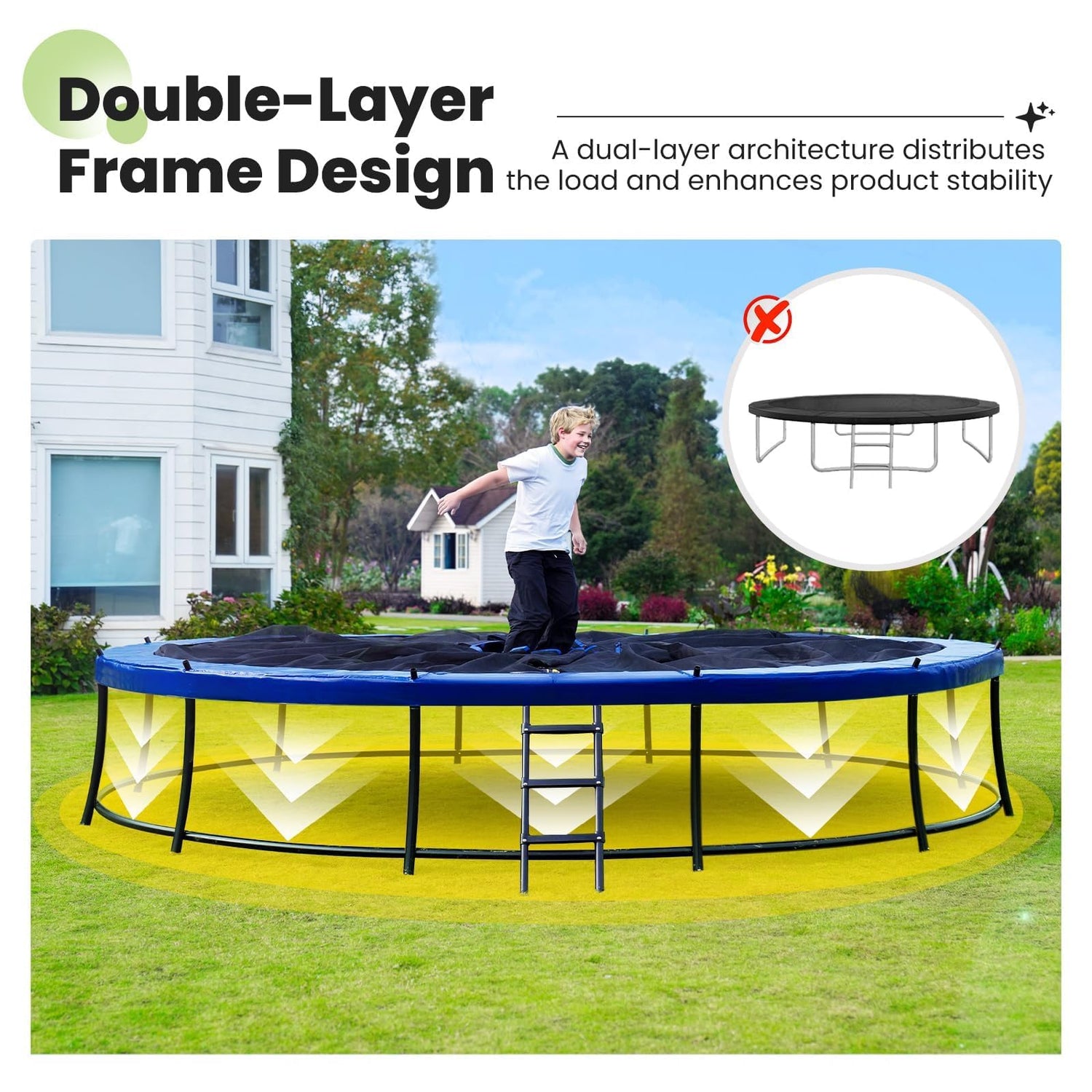- 【Double-layer Frame Design】Experience the next level of backyard fun with Zupapa's latest trampoline, featuring a unique dual-frame design that enhances stability like never before. Our innovative smaller-on-top, larger-on-bottom structure not only redistributes stress to increase durability but also lowers the center of gravity, making it as stable as a tumbler and preventing tipping. Perfect for safe, long-lasting enjoyment!