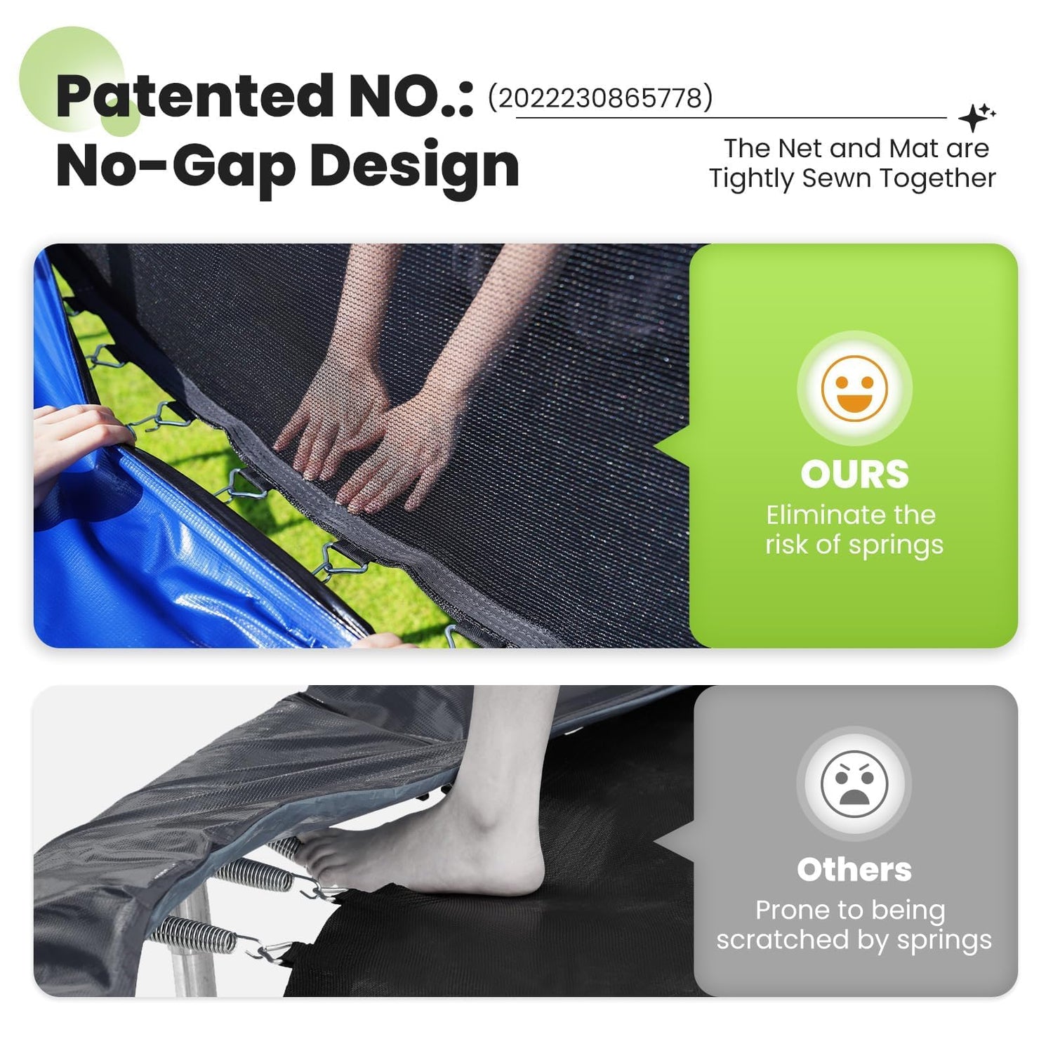 - 【Patented No-Gap Design】Zupapa boasts patented No-Gap design(patent NO.:2022230865778) seamlessly sewns the safety net with the jumping mat to eliminate dangerous spaces, ensuring that kids are protected from springs injuries. This peace of mind allows kids to boldly explore gymnastic stunts like front flips and backflips.