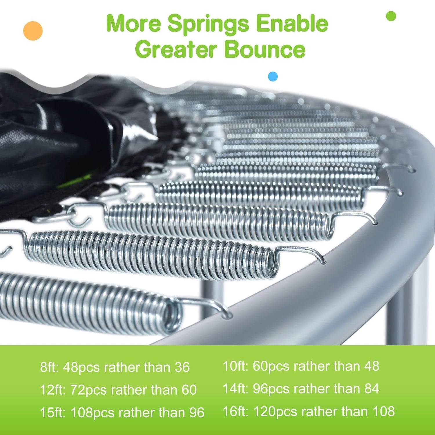 - 【More Springs & Impressive bounce】 As we all know springs are the core of the trampoline, we have 12 more hot-dip galvanizing springs to offer impressive bounce.(7inch for 12&14&15&16ft, 5.5inch for 8&10ft)