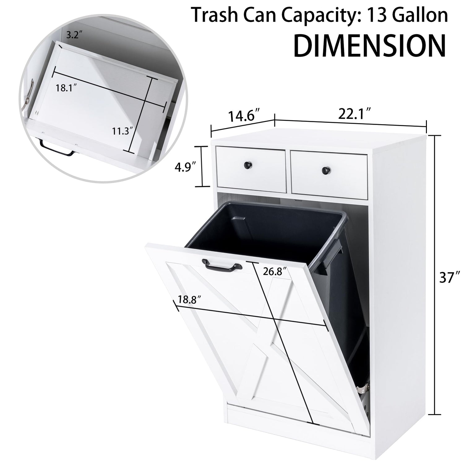 - 【13 Gallon Tilt Out Trash Cabinet with 2 Drawers】: 22.1 "L x 14.6" W x 37 "H (Not include trash can). It's an exact match to a 13-gallon trash can. This is great for keeping the kitchen clean. This cabinet will prevent odors and your pet will never knock over the bin again.