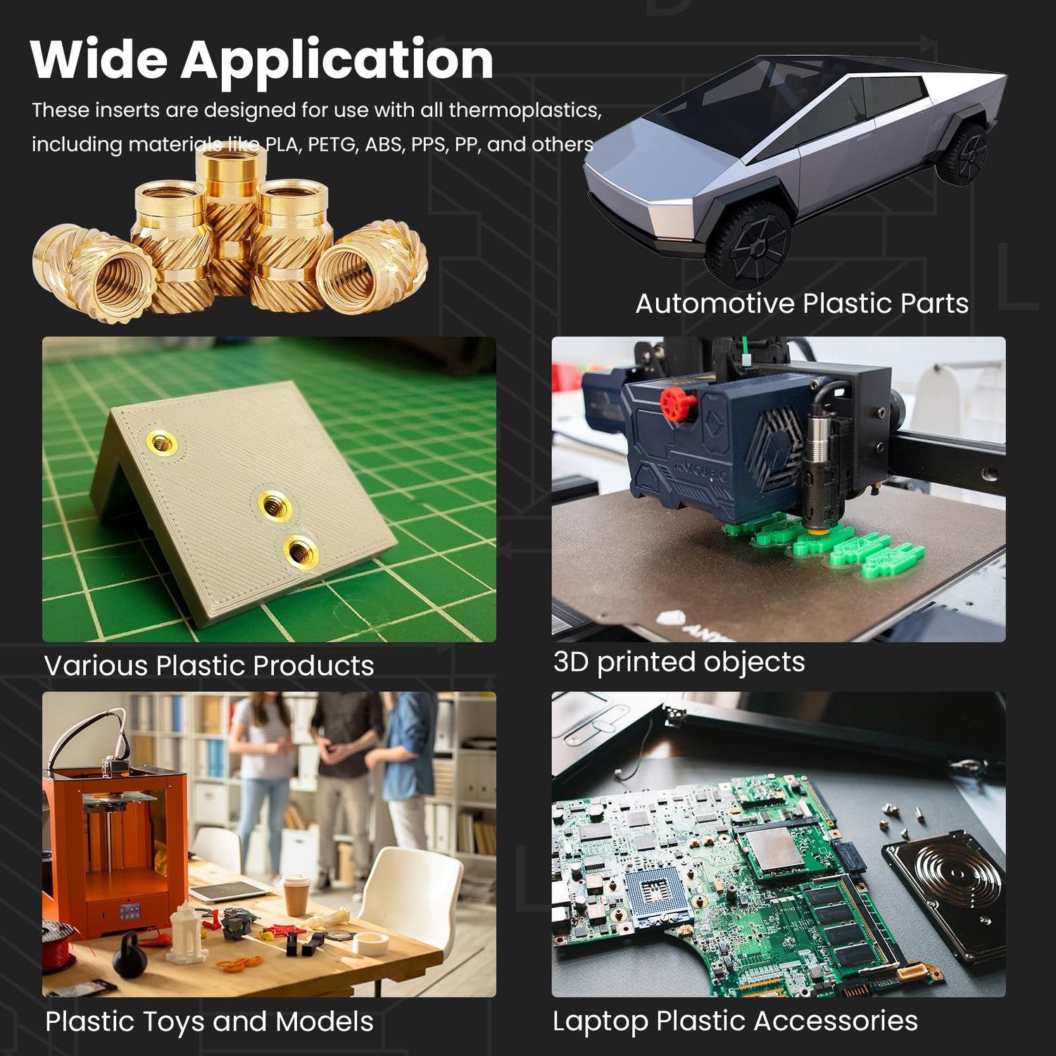 - 【Wide Application】 - These inserts are designed for use with all thermoplastics, including materials like PLA, PETG, ABS, PPS, PP, and others. Whether installing them in 3D printed objects, injection-molded plastic parts, automotive plastic casings, or laptop shells, these inserts offer reliable and durable solutions.