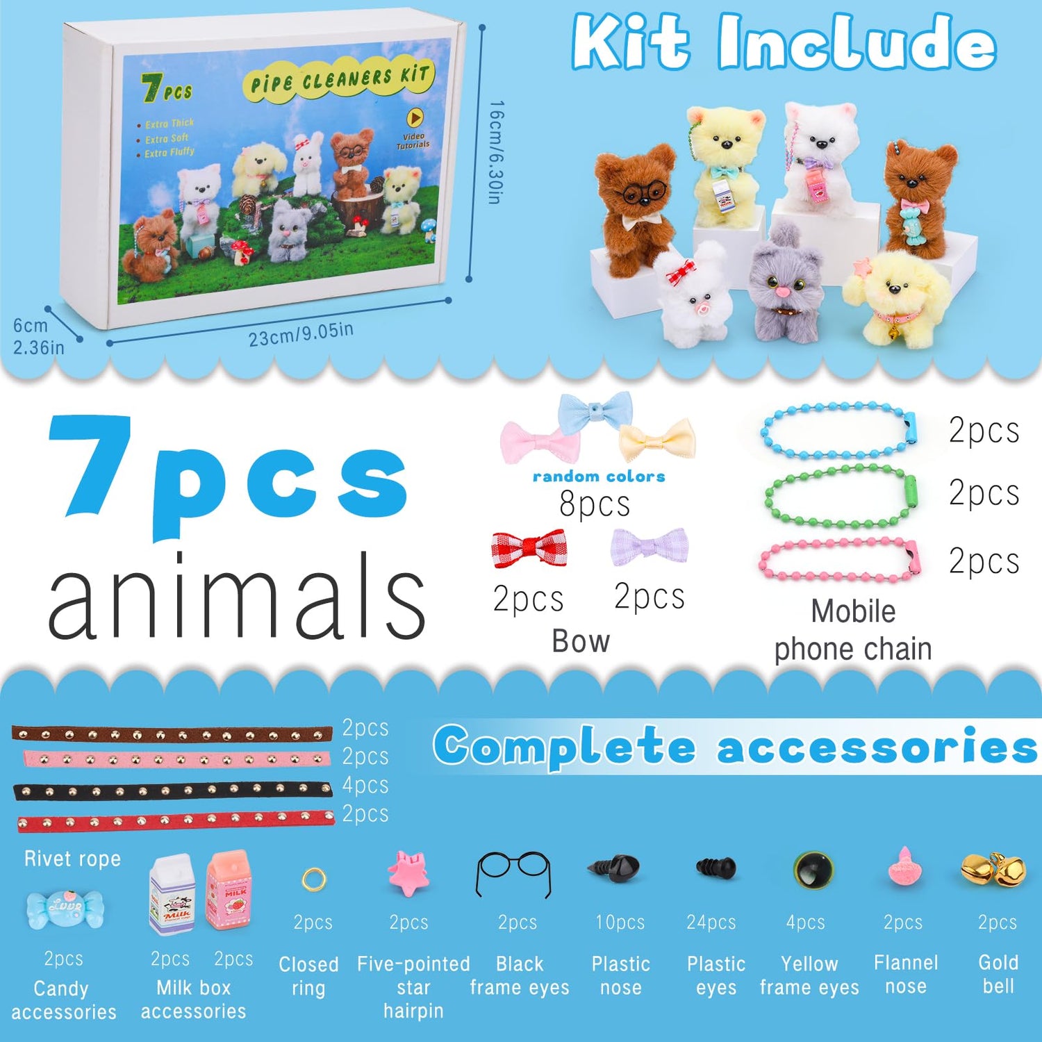 Details: Pipe cleaners craft contains 14 pcs extra thick pipe cleaners, storage box and other accessories for a total of 104 pcs. Extra thick pipe cleaners about 1 m/ 39.37 inch in length and 20 mm/ 0.79 inch in diameter. It comes with a scannable card with a detailed video tutorial, you can practice with pipe cleaners of the same color and refer to the video tutorial to make 7 different types of animals by twisting them. It is very suitable for making with your family.
